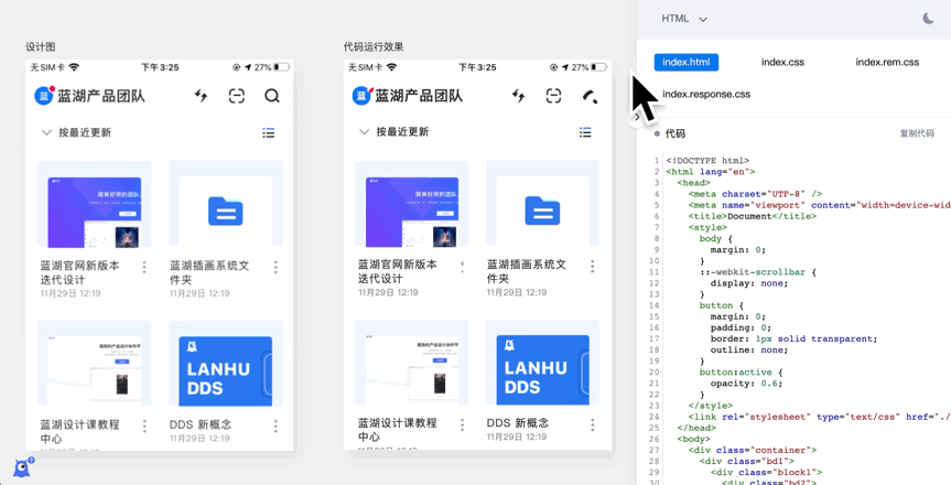 蓝湖【一键生成整页代码】功能,能自动生成 HTML、Vue、React 等框架代码。