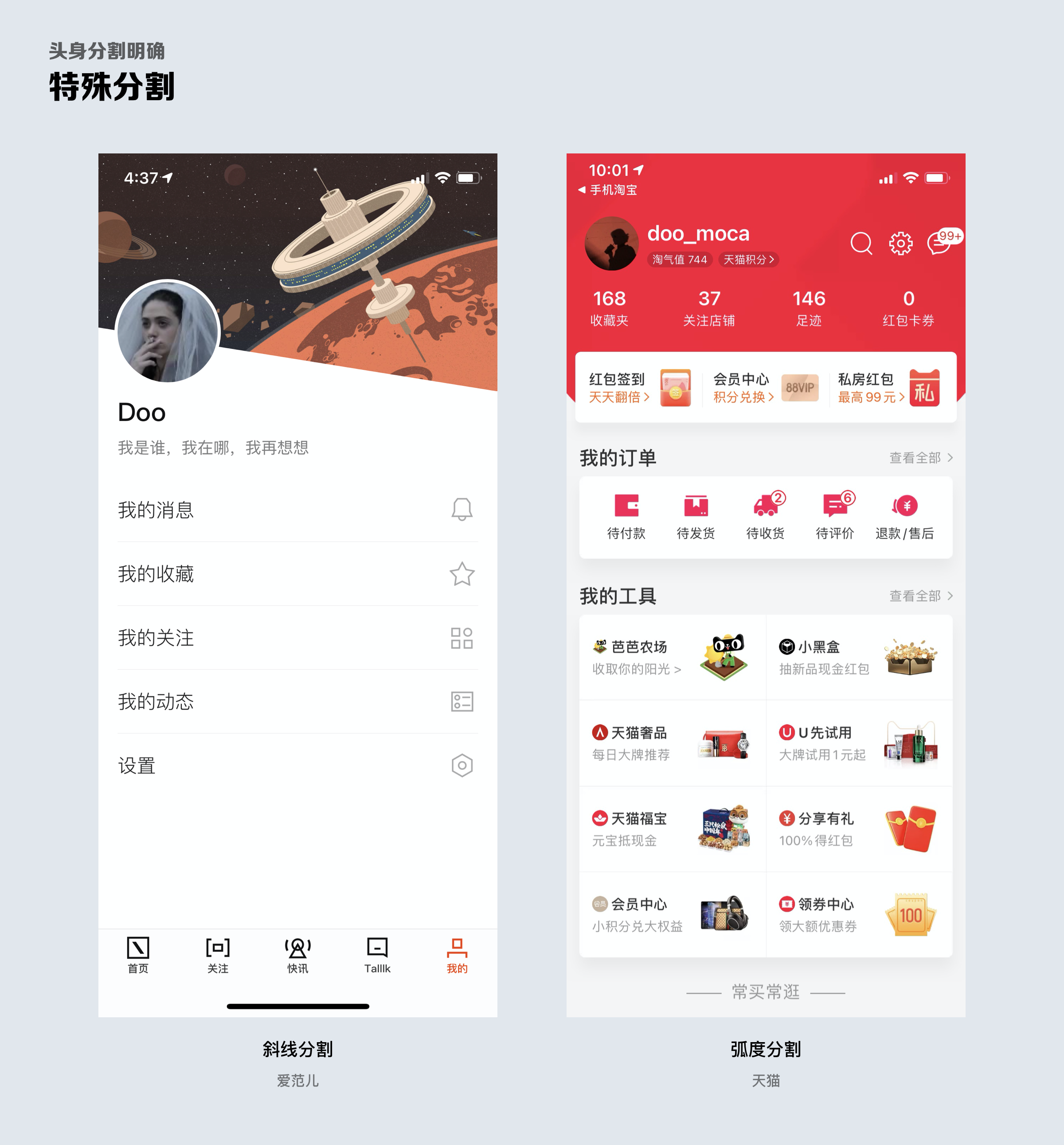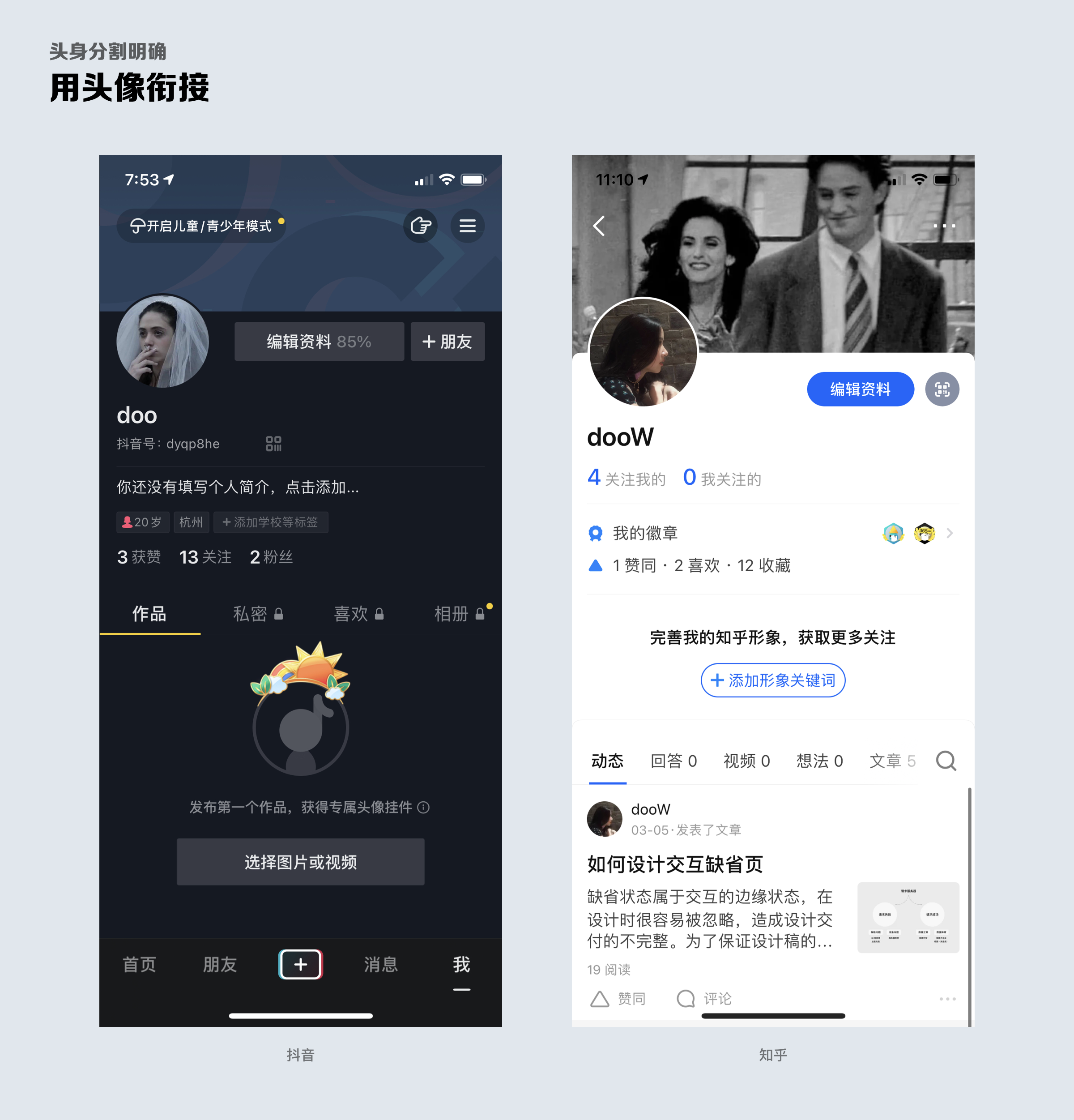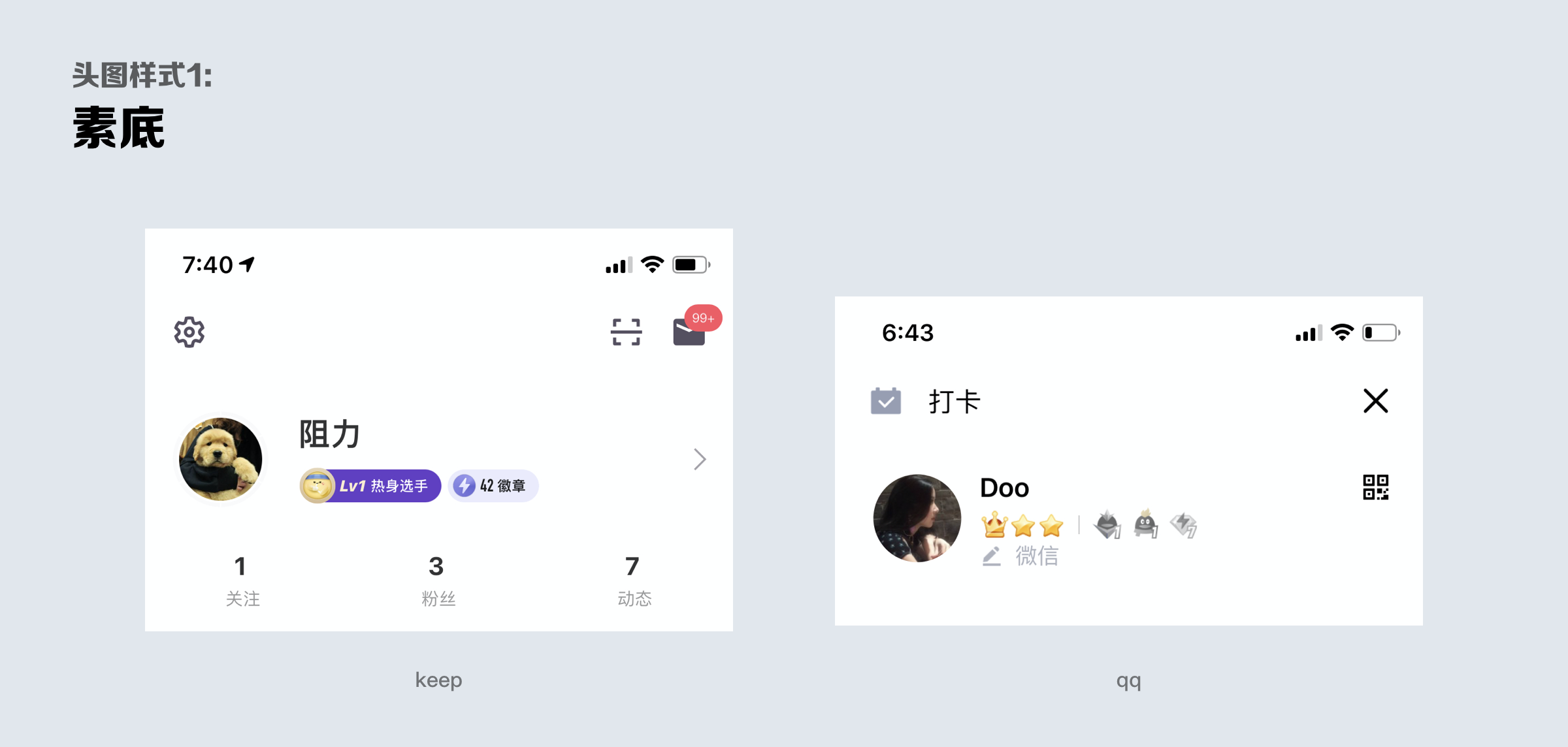 使用此方案的产品比较重视用户个性化表达,从放置头像的位置来看,放置在关键的头身分割线上,头像的面积也往往较大。