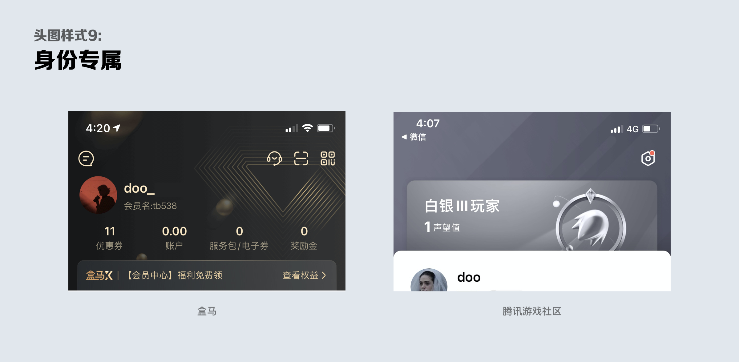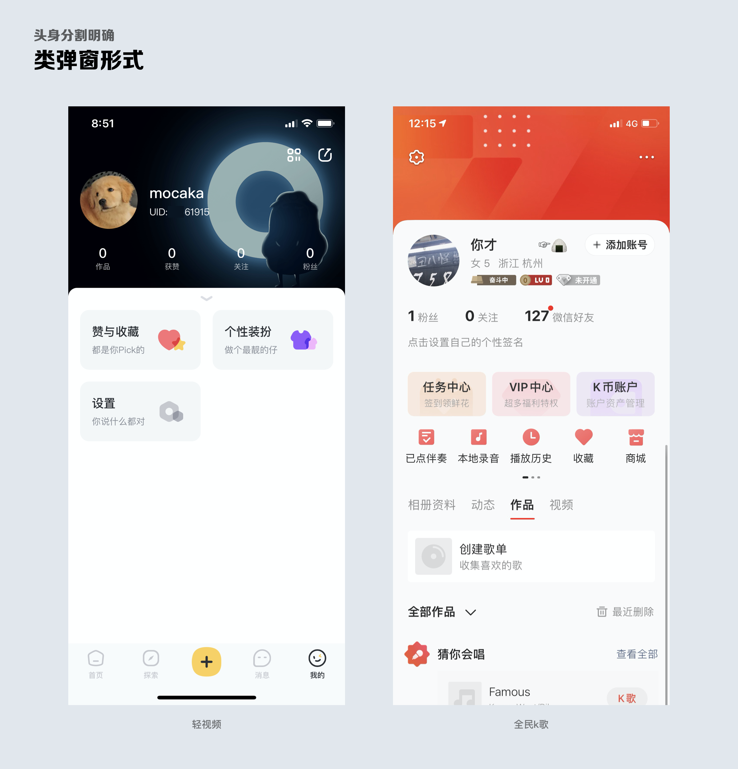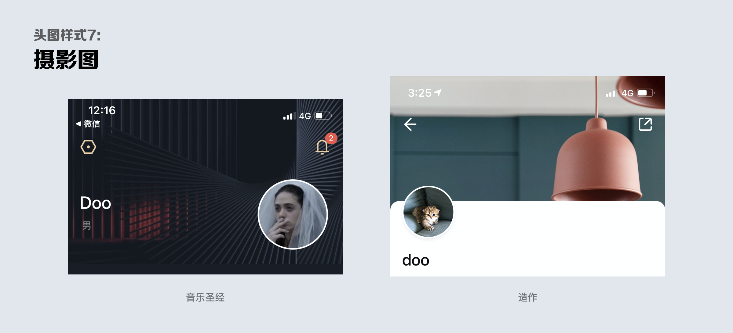 使用此方案的产品比较重视用户个性化表达,从放置头像的位置来看,放置在关键的头身分割线上,头像的面积也往往较大。