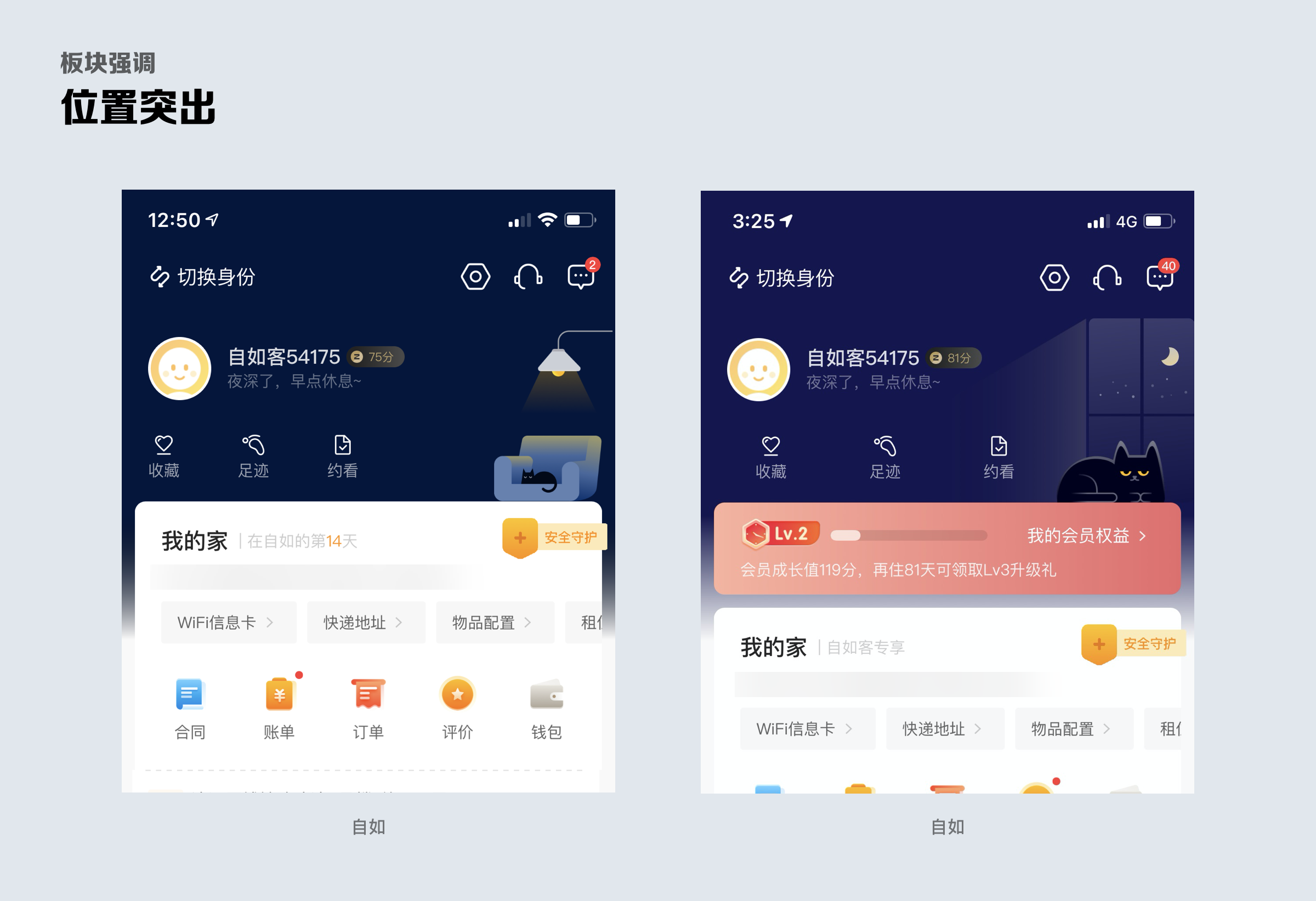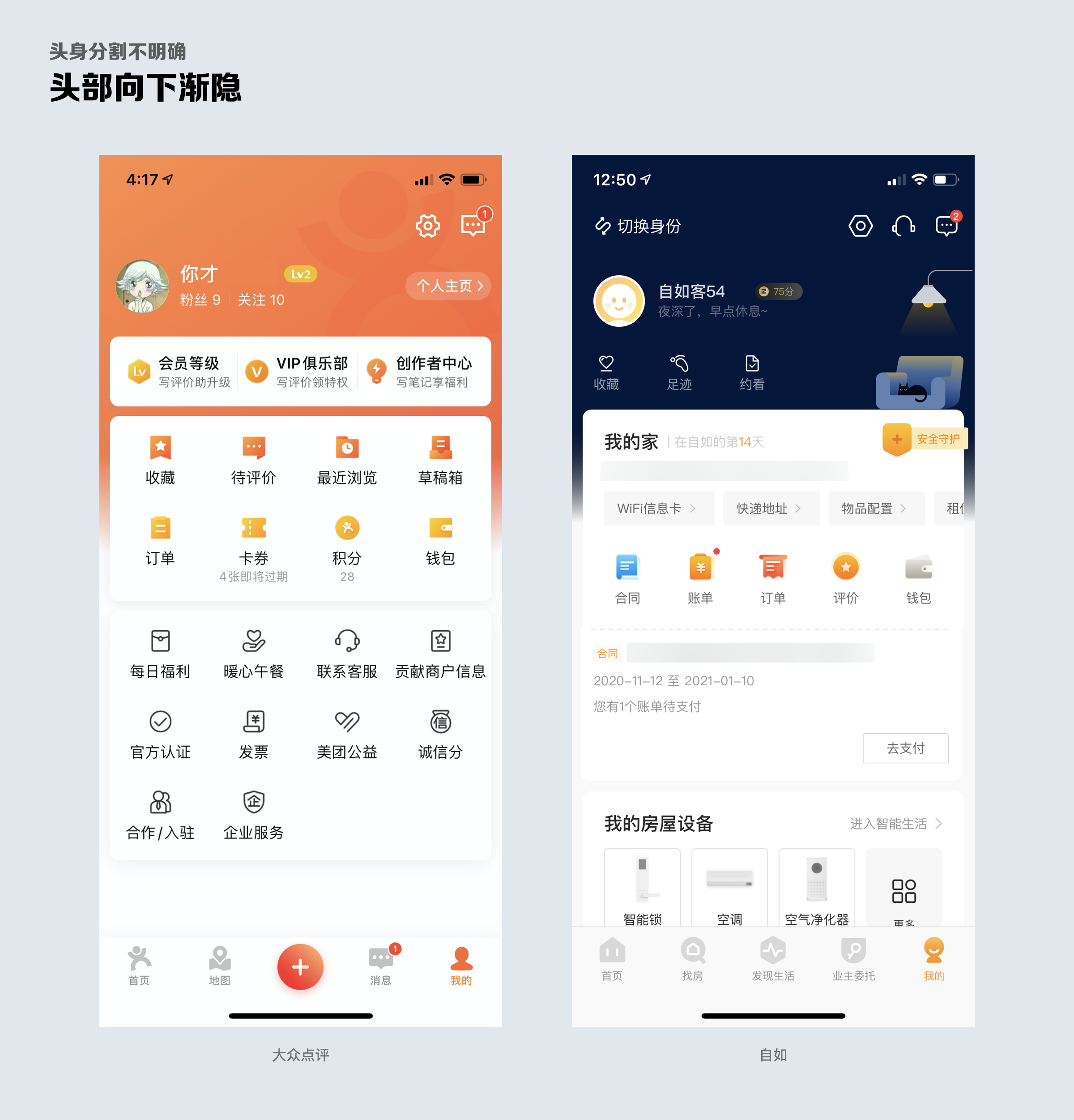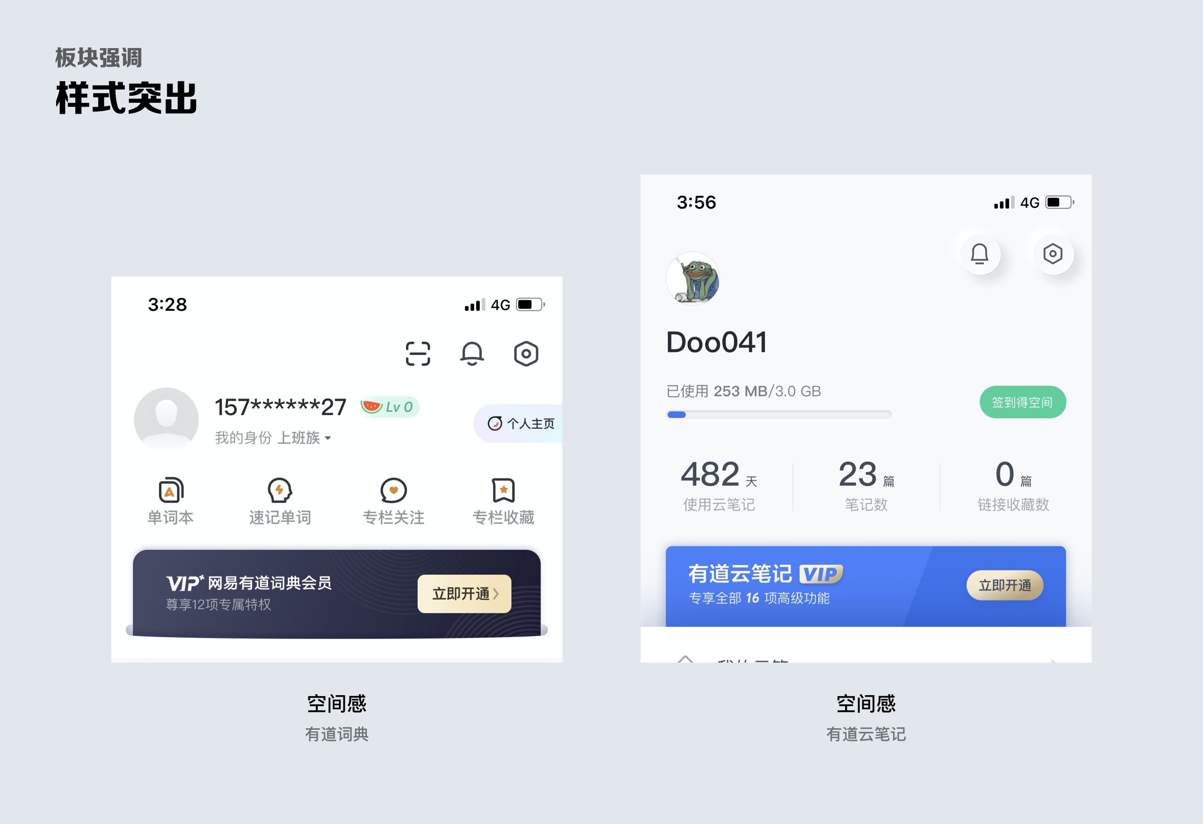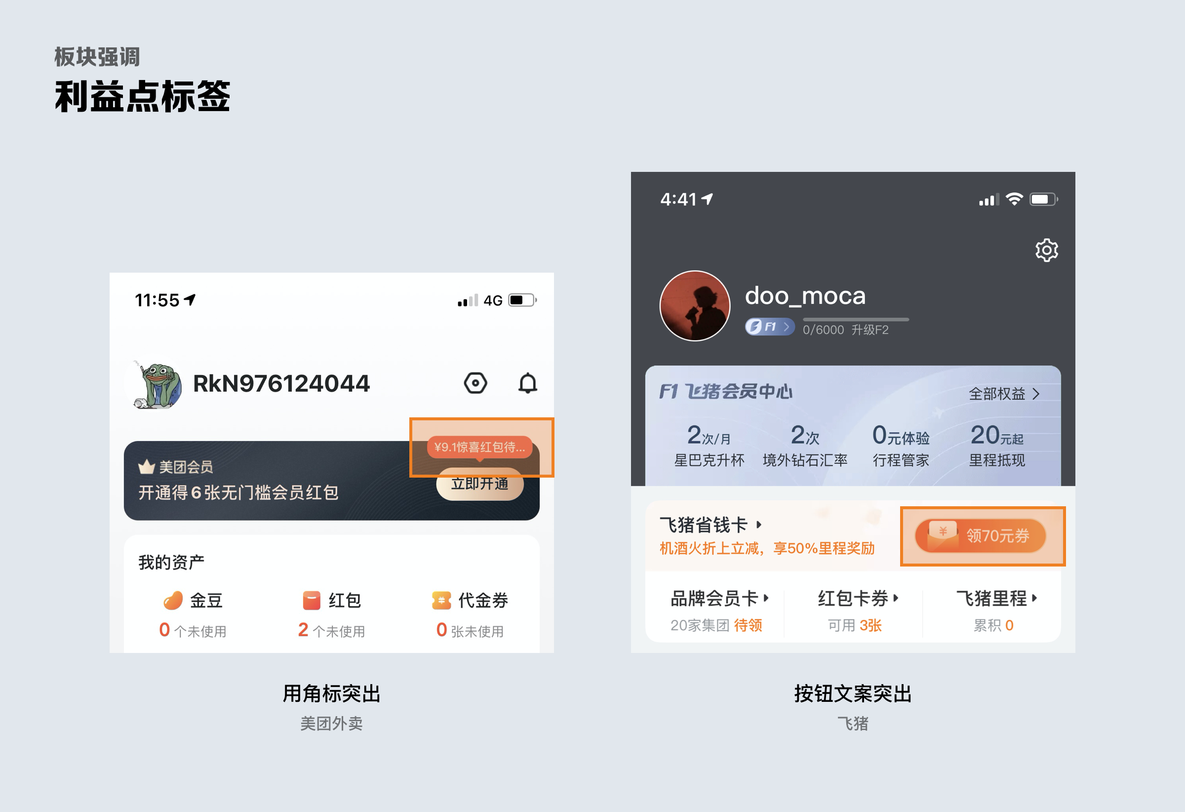 每个页面都有重点信息和次要信息,梳理好信息的优先级,用不同的视觉方式呈现给用户,帮助用户第一时间获取关键信息,提高效率。从产品的角度讲,不同时期的产品有不同的主推内容,现阶段为了增加用户粘性提升市场占比,会员体系的建立相当关键,有会员体系的产品都不约而同地激励用户开会员,争取尽可能多的权益展示机会。个人中心就是一个很好的推广会员的触点。除了推广会员以外,卡券、红包福利,也是推广重点。