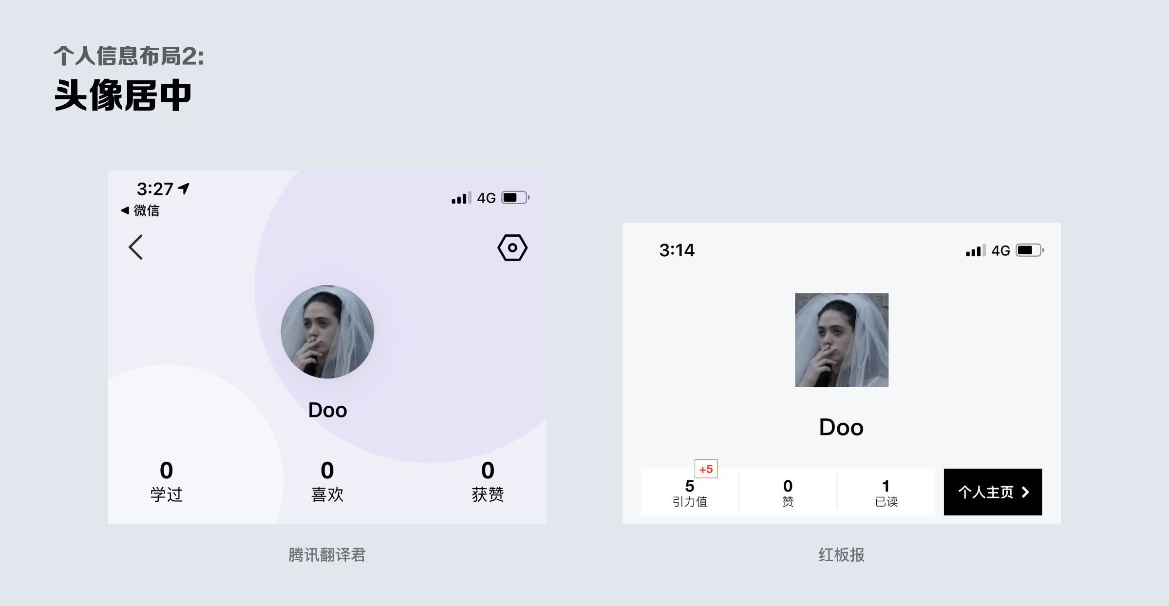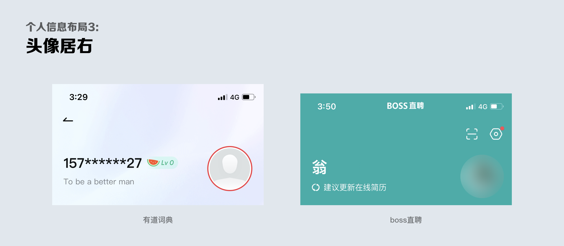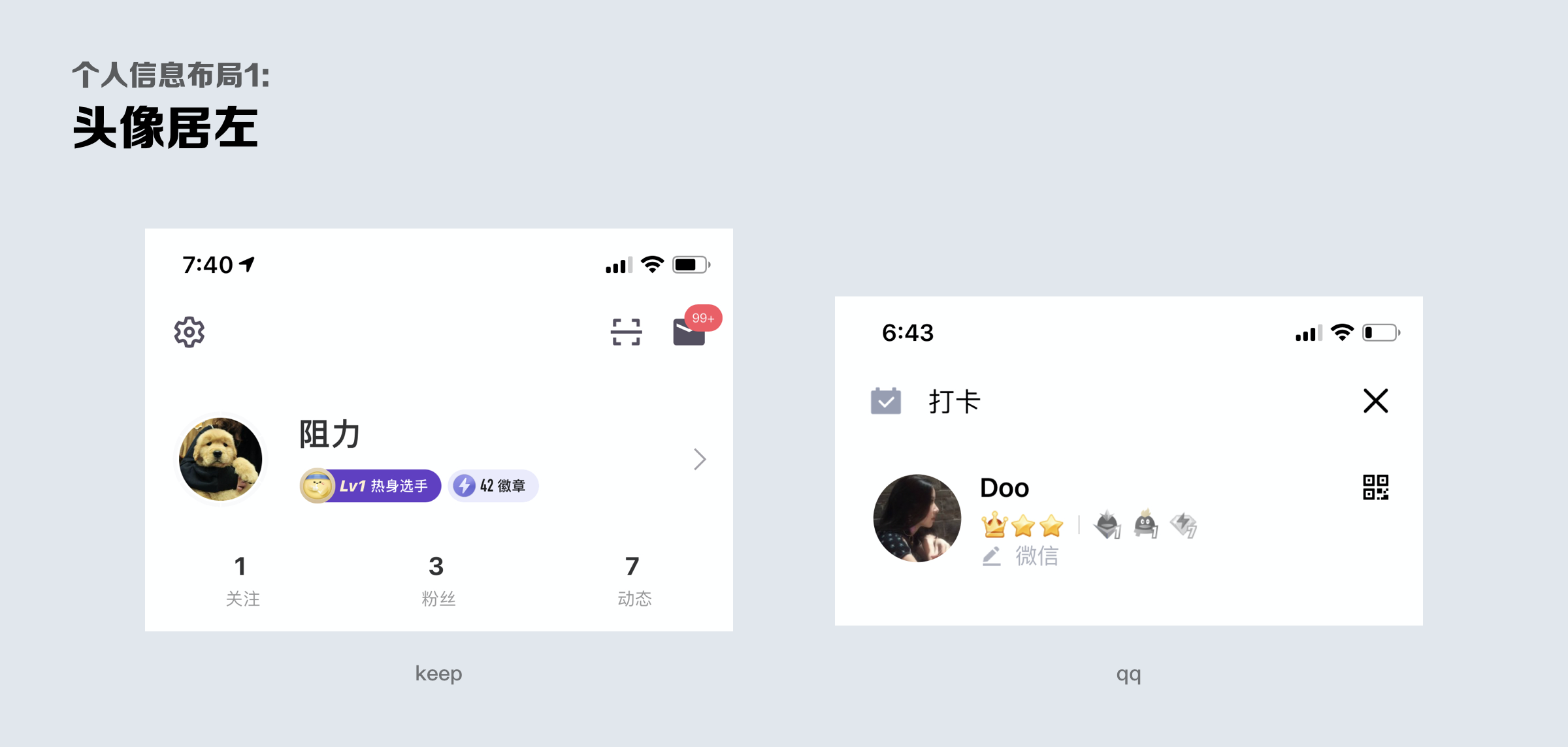 个人信息模块一般包含:头像、昵称、身份属性这类内容。从布局上来看,一般有以下几种排版方式: