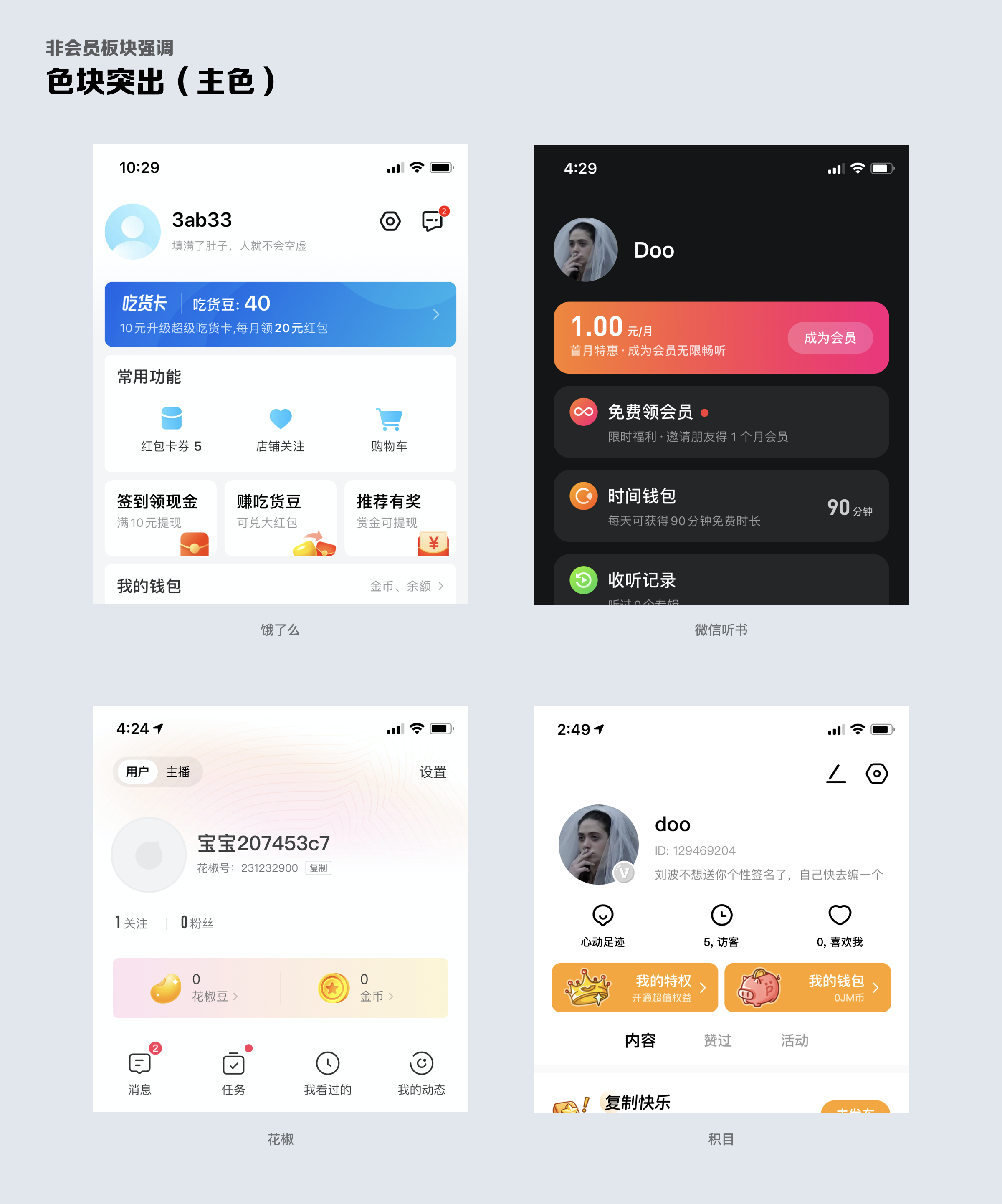 非会员类型的板块,经常使用主色进行突出。板块与背景颜色对比度越大,越突出。用色逻辑与按钮用色一致。若不想过分强调,可以使用浅色背景,参考花椒案例。