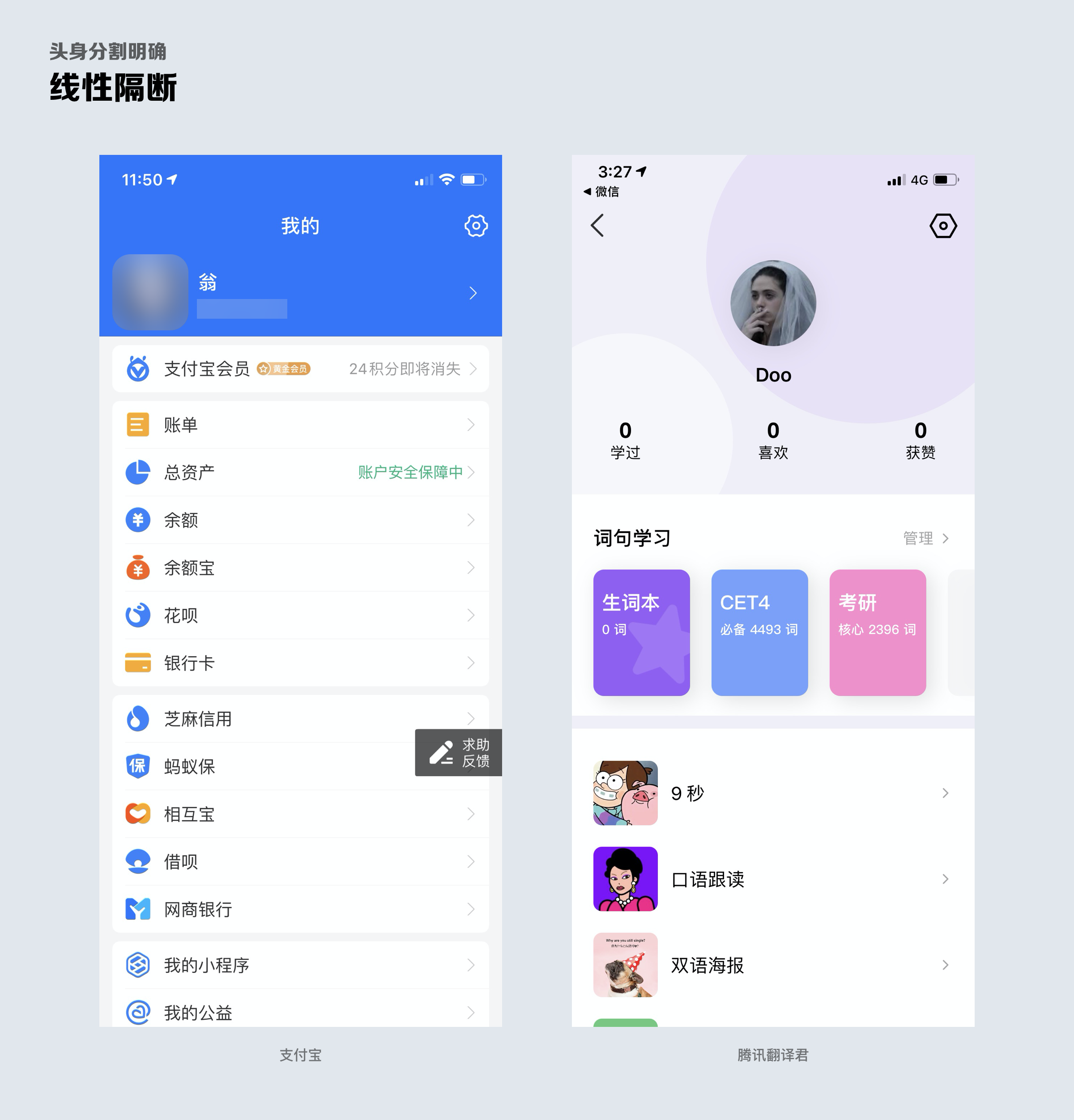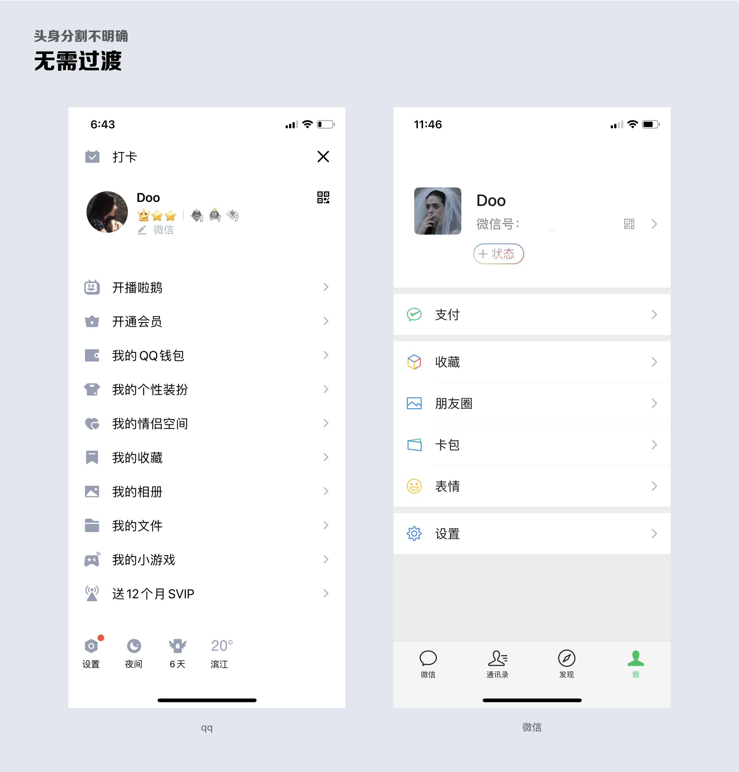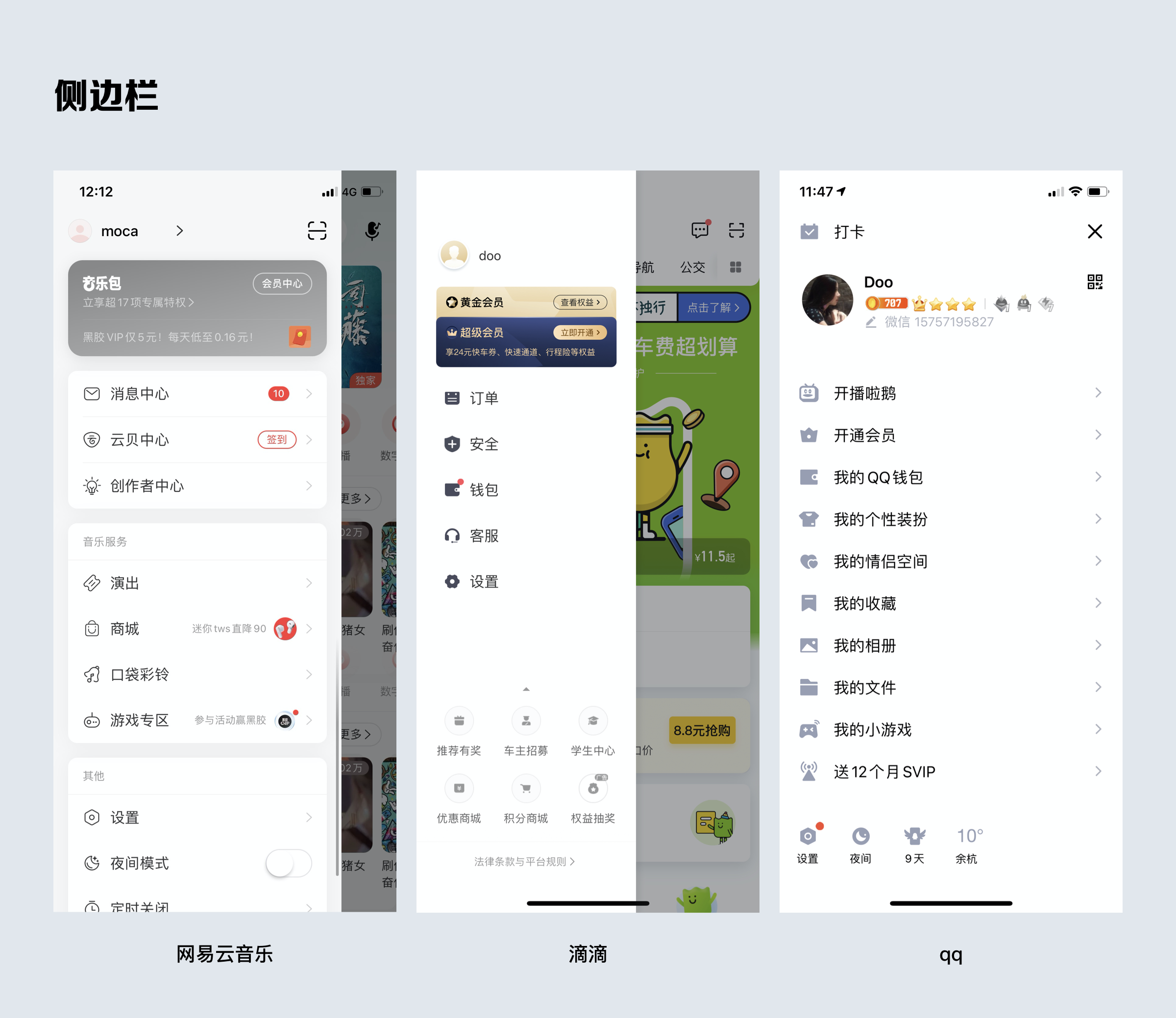 一般有Tab Bar的产品会把个人中心放在最后一个或者倒数第二个tab里,有些产品没有Tab Bar,如滴滴,该类工具型产品常使用侧边栏的形式盛放个人中心相关信息。有些产品有Tab Bar,依然将个人信息收纳在左上角,如网易云音乐和qq。其中qq采用了全屏的侧边栏形式。