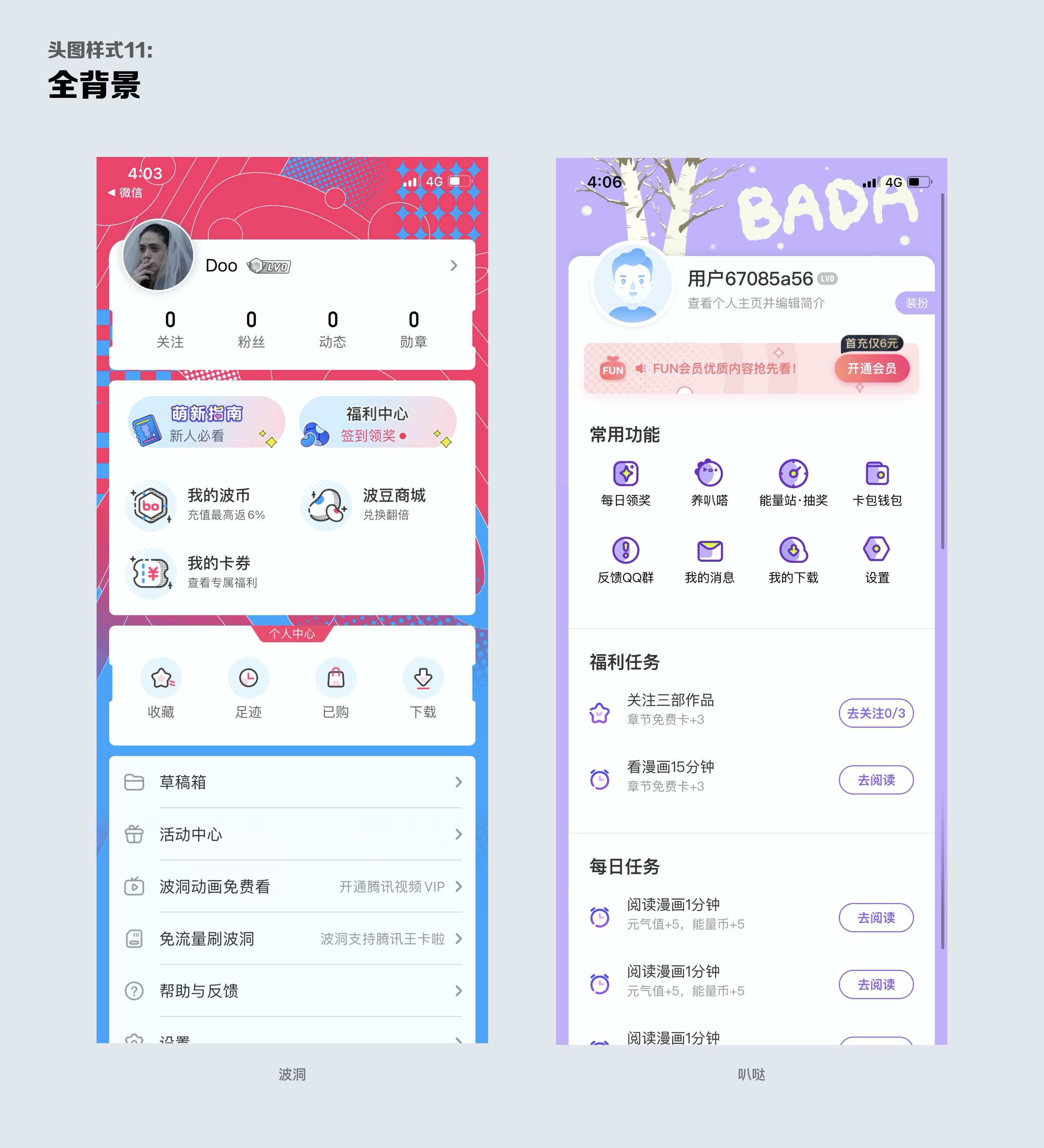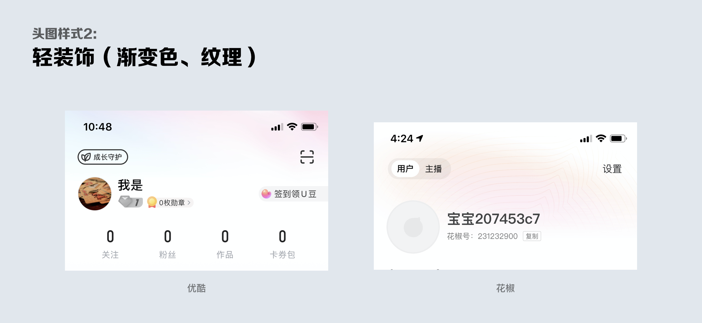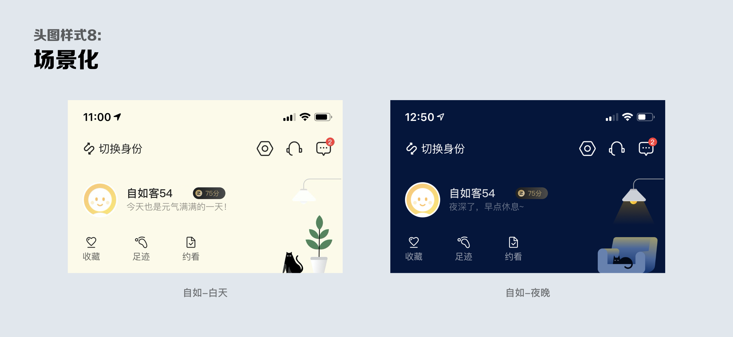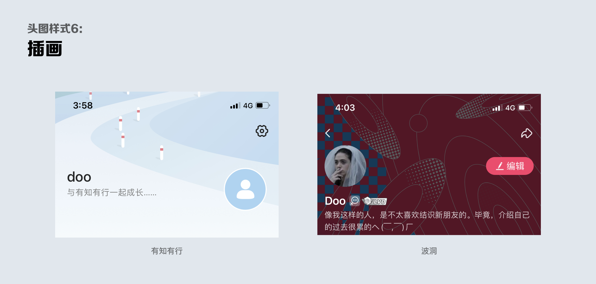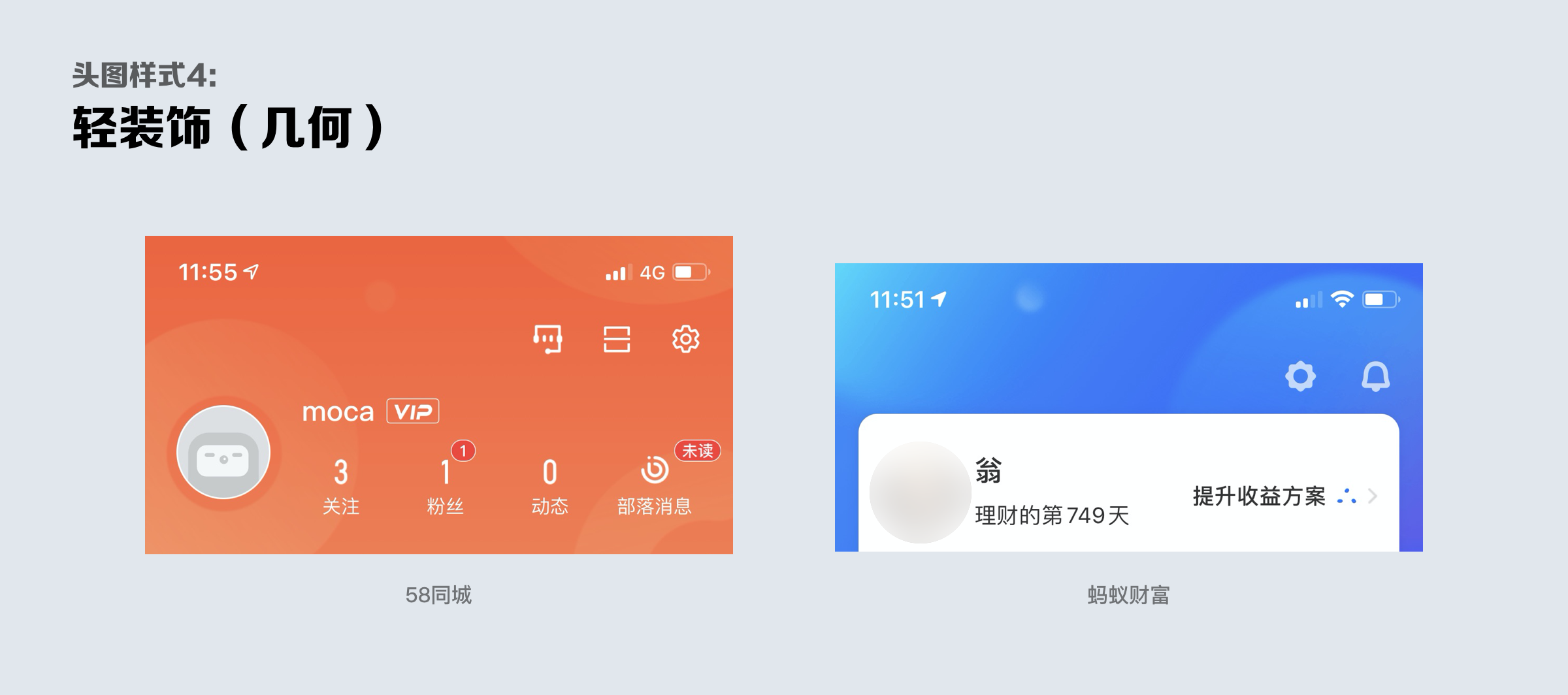 个人信息一般放置在页面顶部,顶部设计形式多样,结合产品的业务属性和风格调性,选择合适的样式。一般带有社交属性的产品的个人主页,鼓励用户充分展示个性,允许用户自主上传背景图片。而对于其他产品来说,稳定和秩序感比个性更加重要。