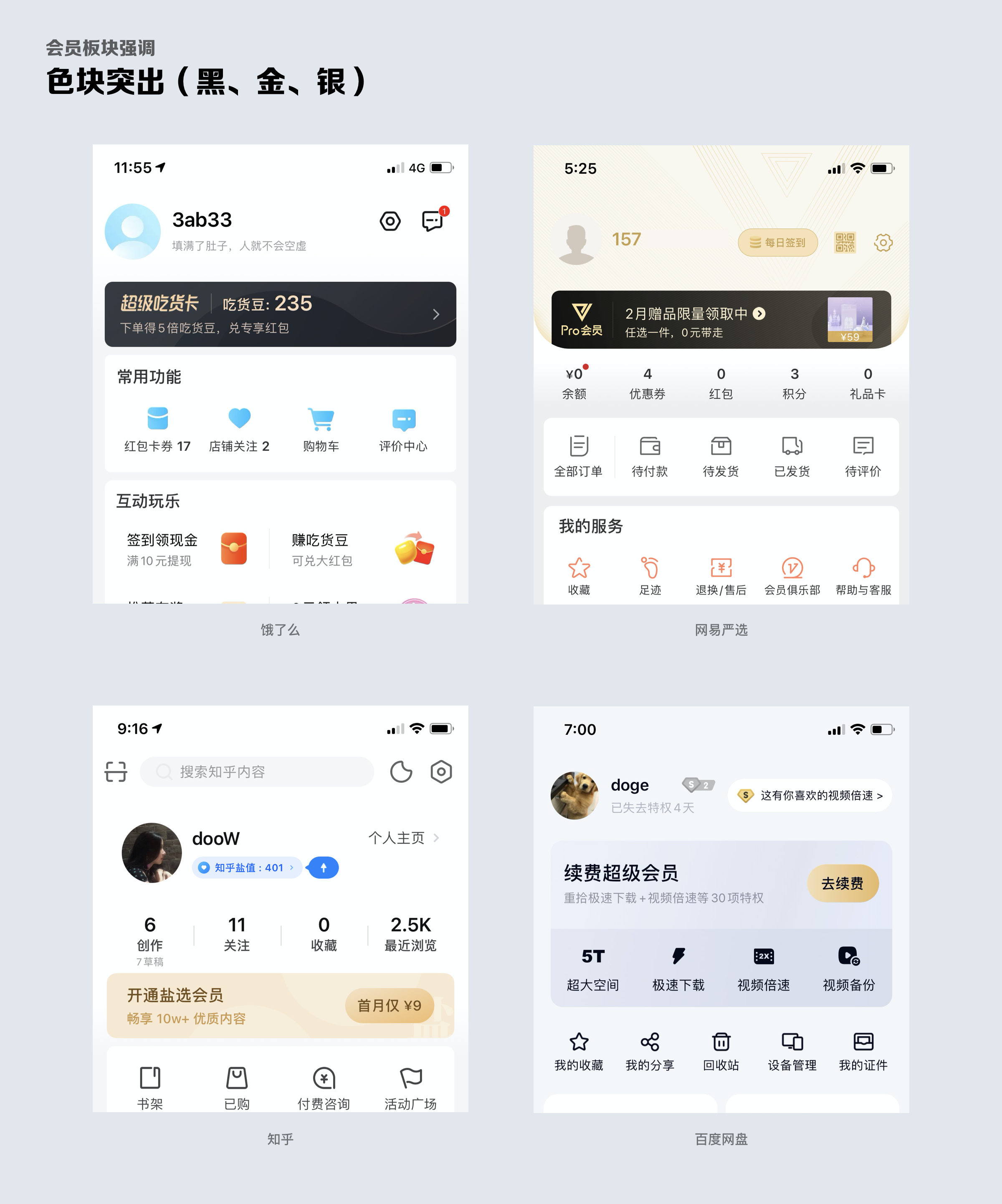 用户已经对会员概念有一种大概的既定认知,“特权”、“尊享”等关键词是设计会员板块的指向,与之匹配且应用广泛的配色主要集中在:黑、金、银三大类,和一些延伸色如玫瑰金、鎏金等。这类用色虽然不能体现品牌感,但已经成为移动UI下的一种既定语义,用户能将金属色与会员直接地联系起来。