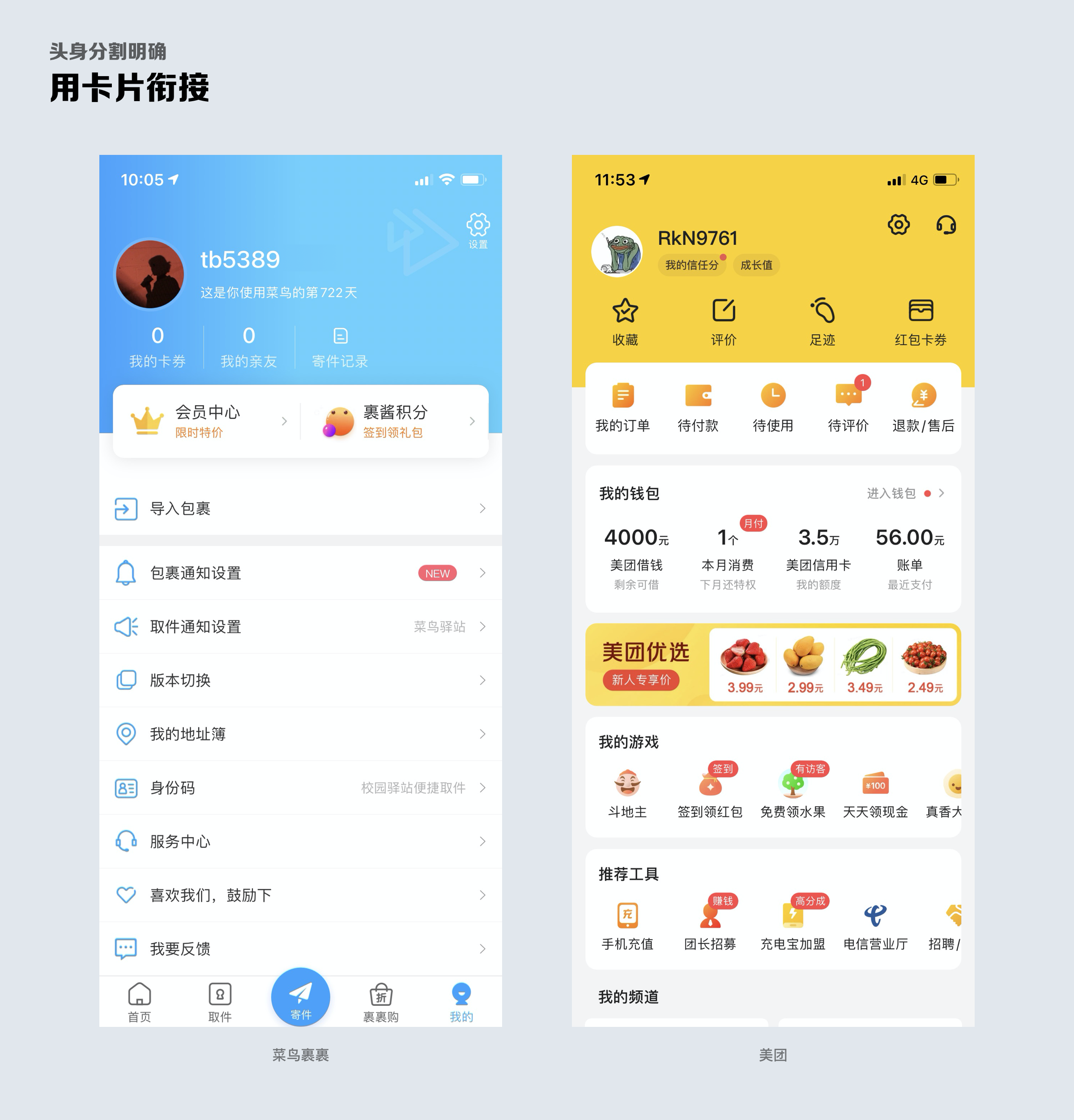 这种情况头身同样有一条明确的分割线,用卡片置于其上,作为衔接,视觉上更加和谐紧凑。且位于分割线之上的卡片往往承载的是最重要信息,如订单信息或会员信息。
