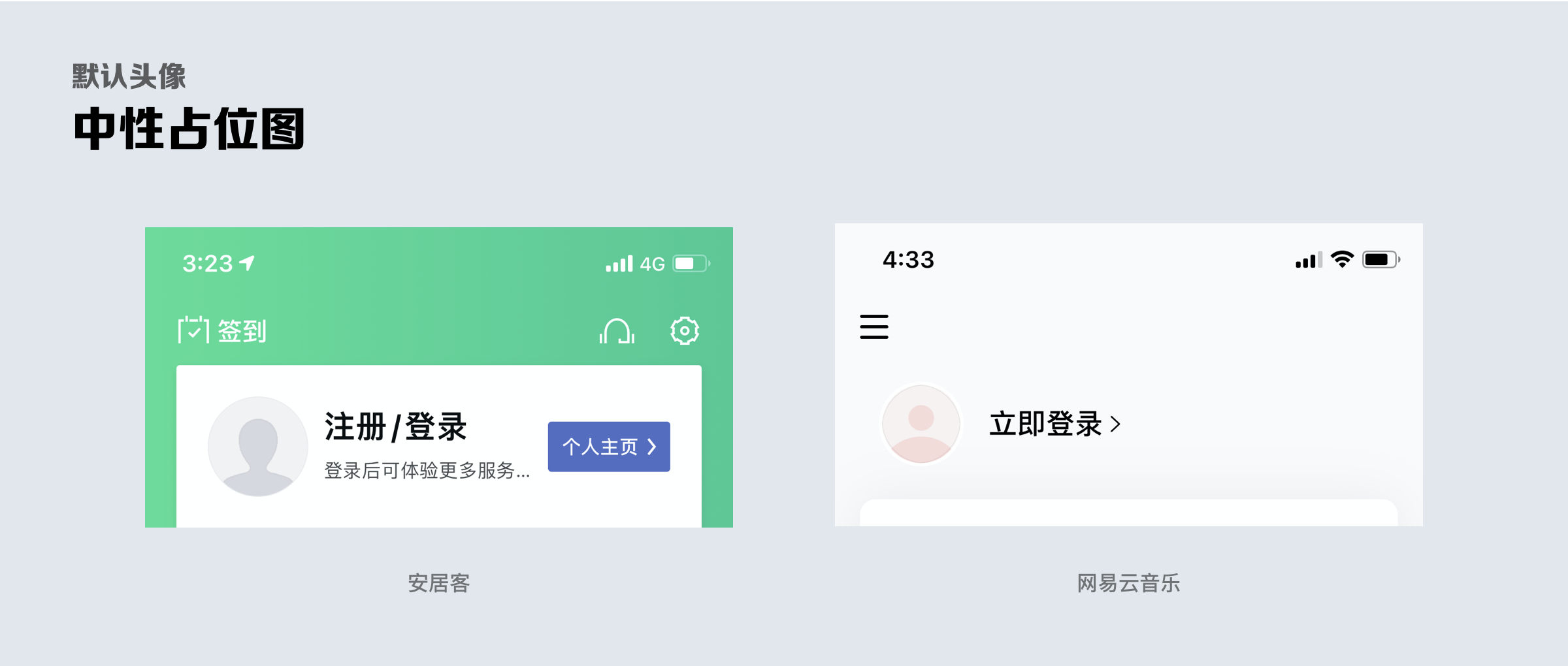 当用户是未登录状态时,有些产品不向用户开放浏览个人中心页面的权限,要求用户必须先完成登录注册。更多产品允许用户进入个人中心页面,当用户触发某个操作时,提示用户进行登录。未登录状态下的个人中心,没有用户信息。默认头像和昵称的占位文案的处理方式值得探讨。