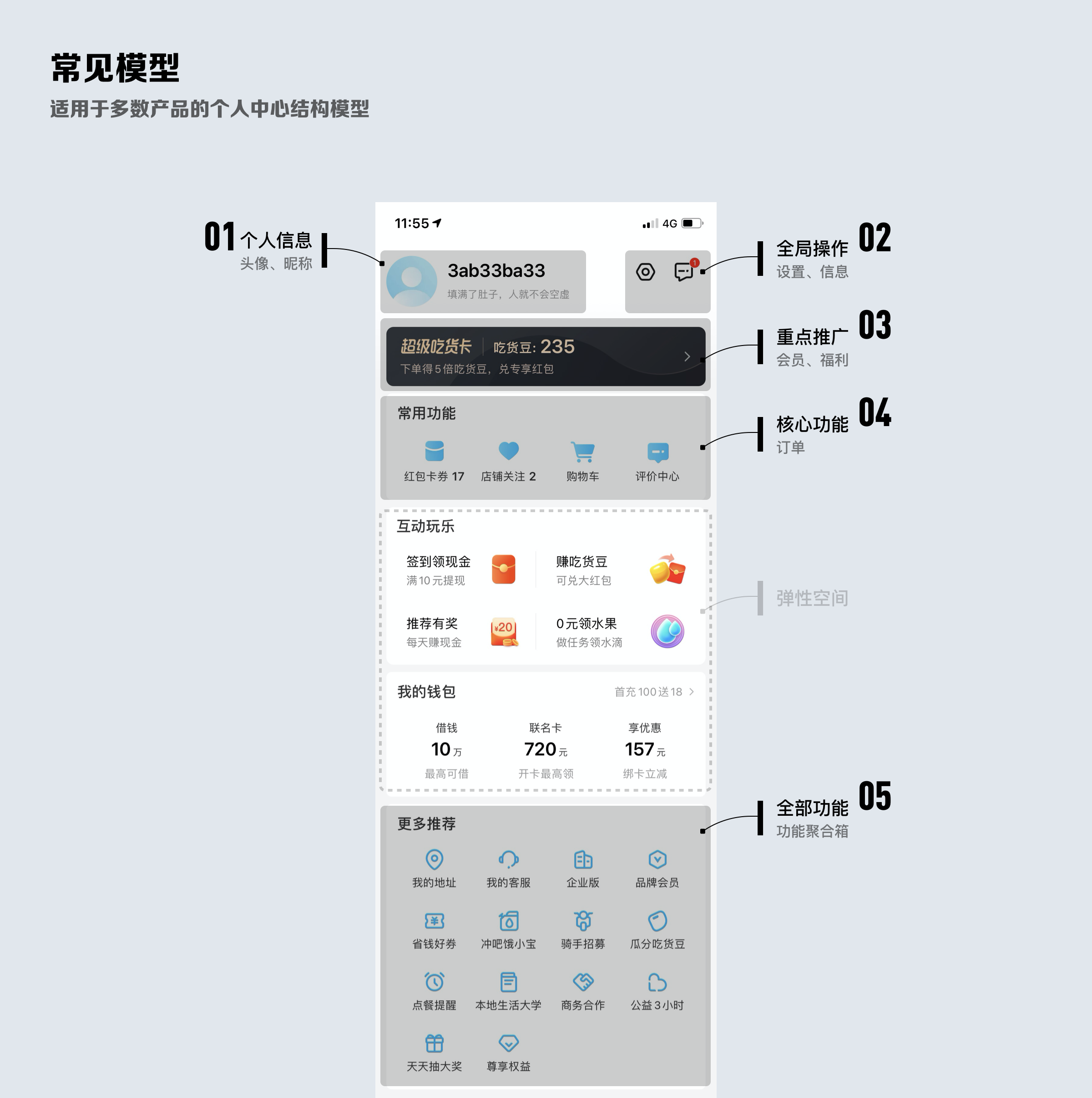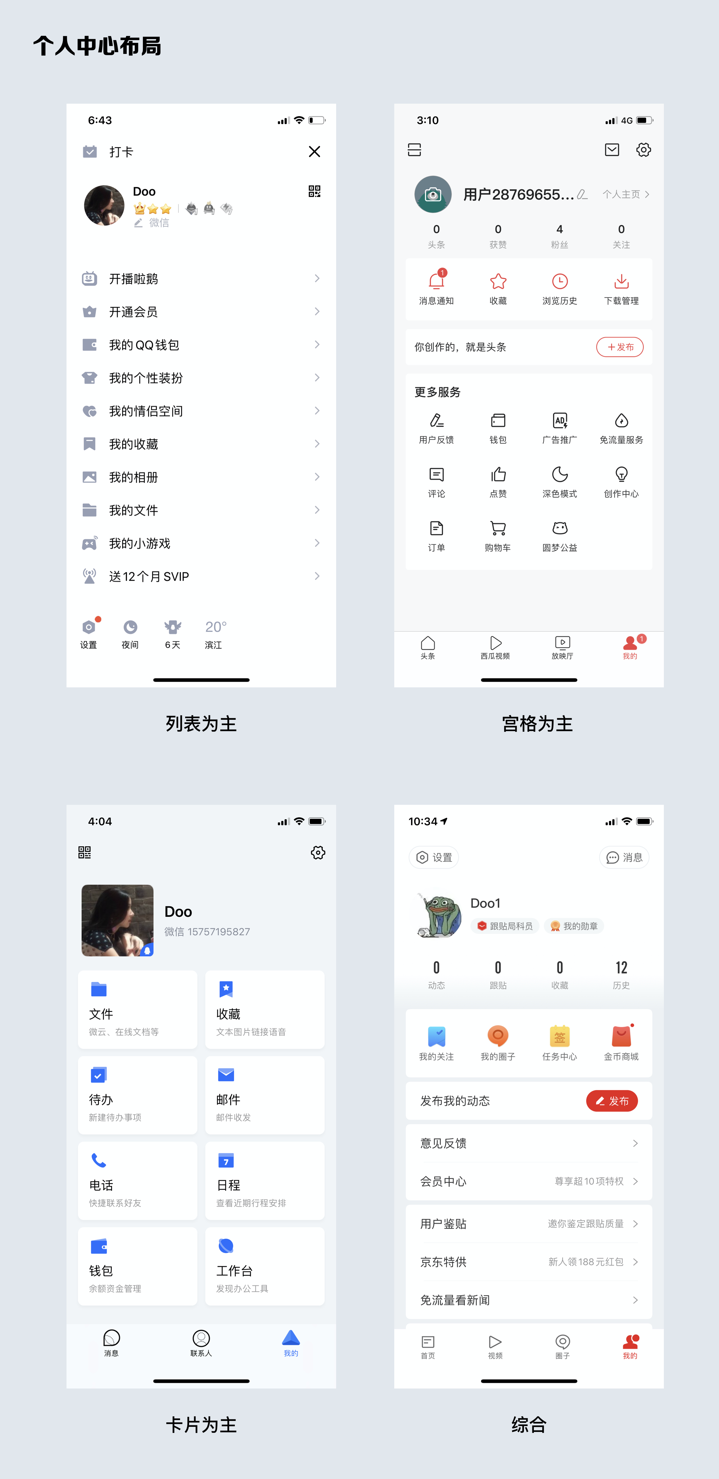 个人中心主要分为两大区块,头(个人信息+全局操作)+身(功能集合)。头部信息的布局方式上文已经有所阐述,主体部分一般承载的内容是个人中心页面的各种功能集合,承载形式有:列表、卡片、宫格、泳道。
