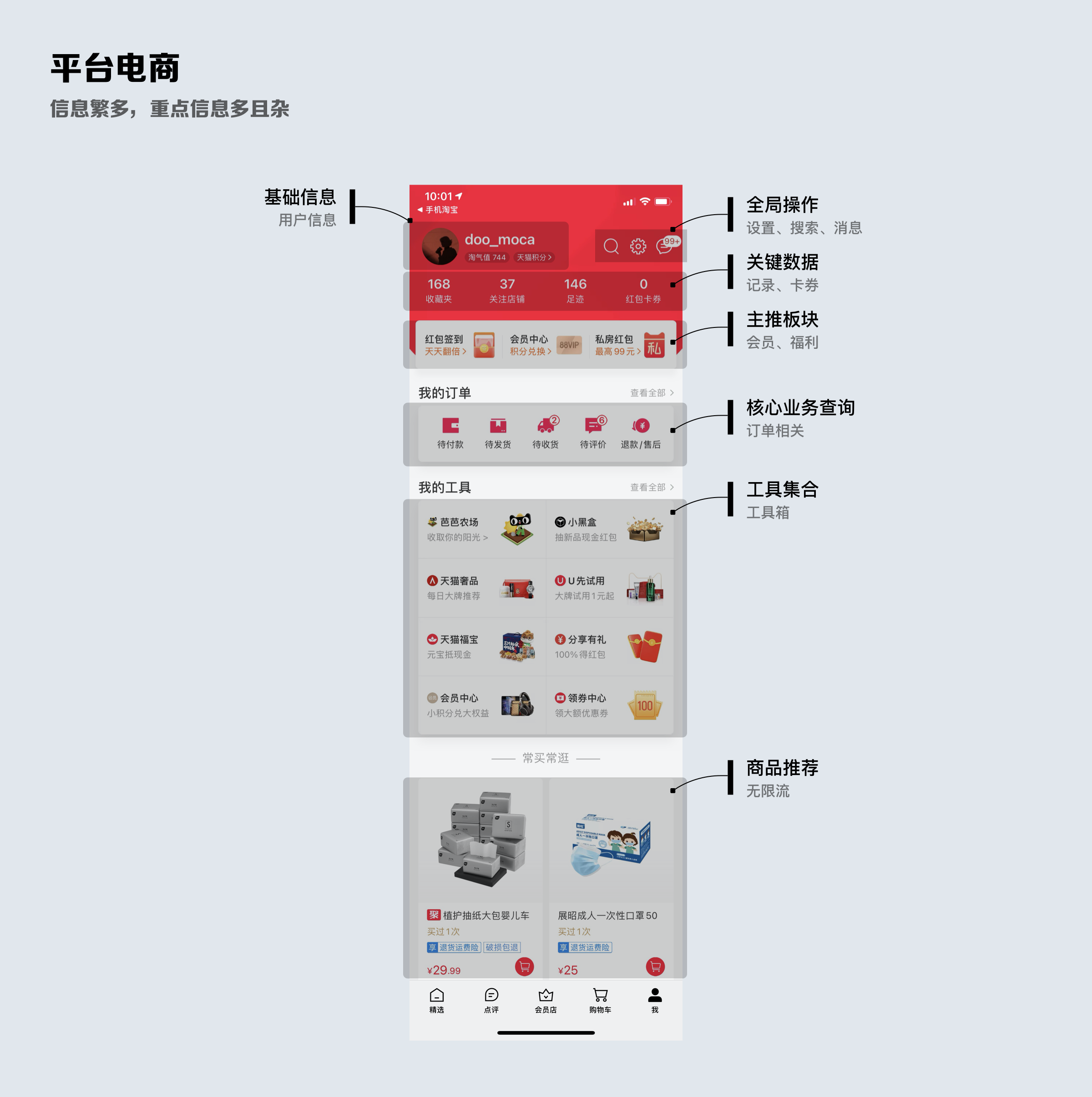 个人中心的信息复杂度与产品本身有关。体系越庞大的产品,对应个人中心页面需要承载的内容越多,结构势必复杂。一般平台型电商的个人中心页面必须涵盖:用户基础信息、全局性操作(设置)、关键数据记录(收藏、关注)、购买激励(会员、红包)、核心业务(订单信息)、工具集合(工具箱)……