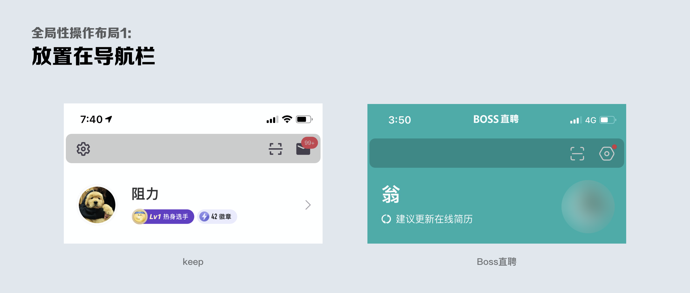 这种布局方式拓展性最强,导航栏可以盛放多个控件而不会出现布局局促的问题,同时符合用户使用习惯,设置放在右上角或者左上角,也是最常见方案。