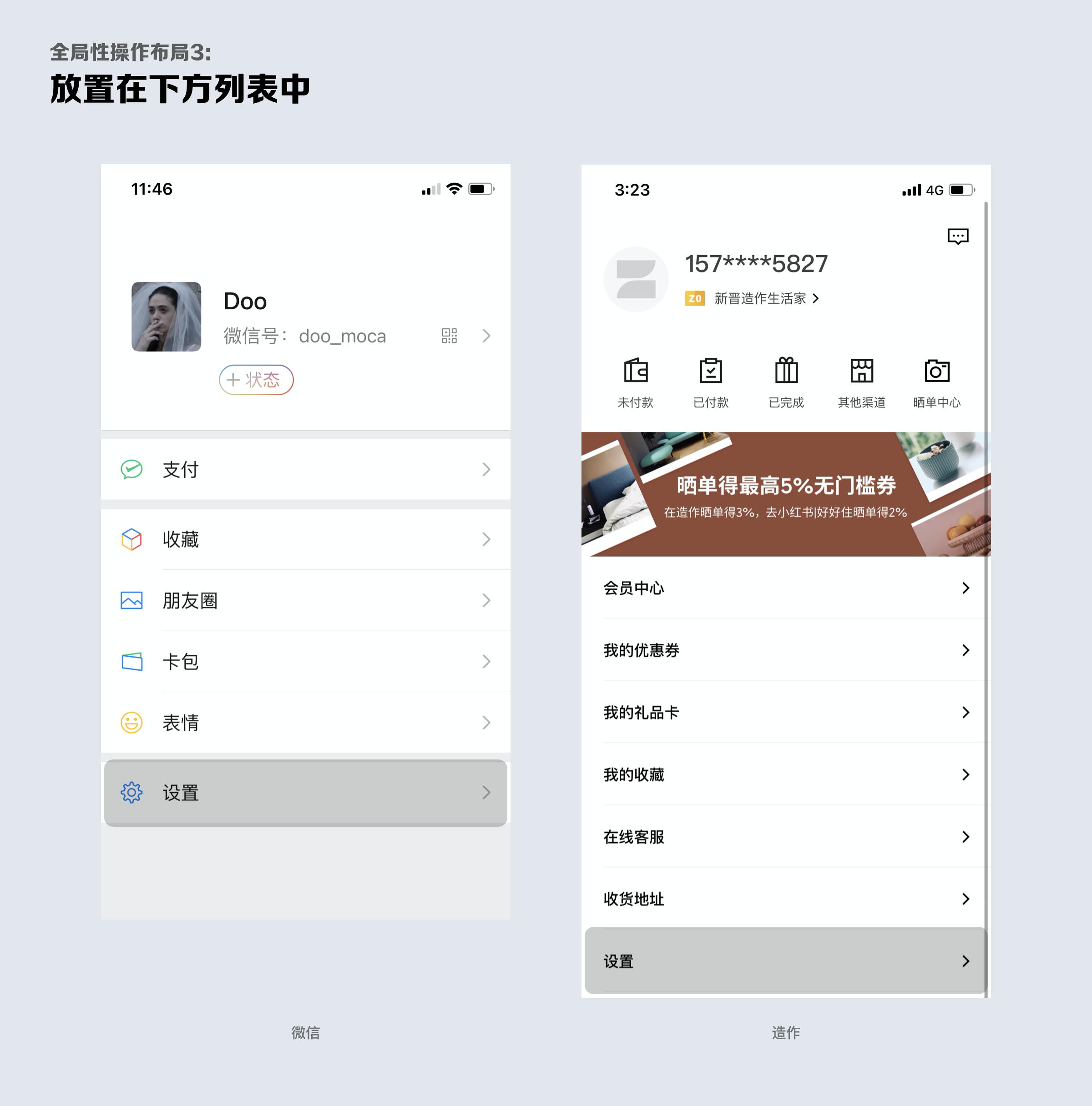 这种布局方式弱化了“设置”,通常认为如果“设置”的优先级较低,无需单独将其展示在头部,直接以列表的形式放置在底部即可。