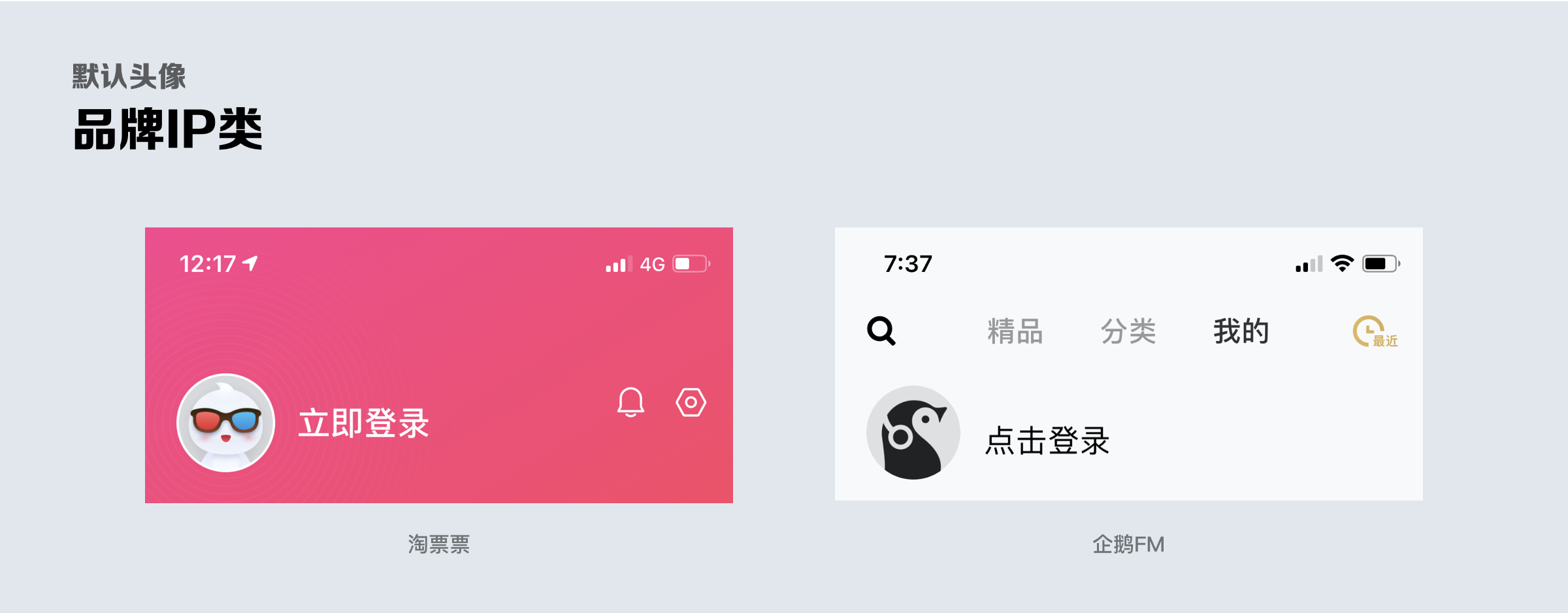使用ip作为默认头像,兼具品牌感和设计感。快捷登录直接在个人中心页面露出登录方式,减少交互步长。