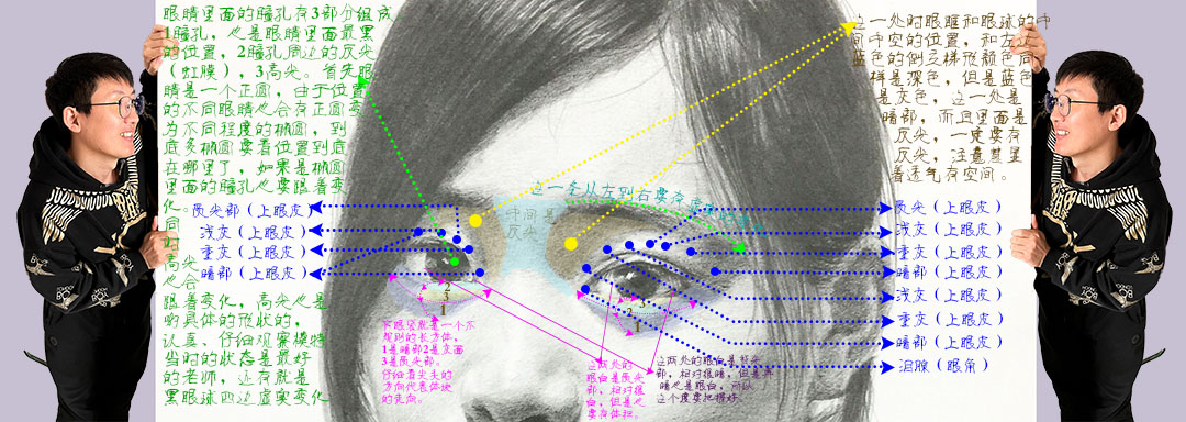(见上图黄色虚线)这一处是眼眶和眼球的中间中空的位置,和中间蓝色的倒立梯形颜色同样是深色,区别是蓝色虚线的倒立梯形由于还受一点点的光,所以是灰面;但是黄色的两个部分完全是暗部,所以是暗部,但是在画的时候里面一定要画出反光,怎么画的?重四周松中间,就是说四周加重,中间虚一些留出反光出来,里面是一个”坑”,一个“窝”,这样画的好处是有空间感和透气感。离远看可以用你的手指插进去,是有空间的。如果你之间平涂的画,完全是平面的。