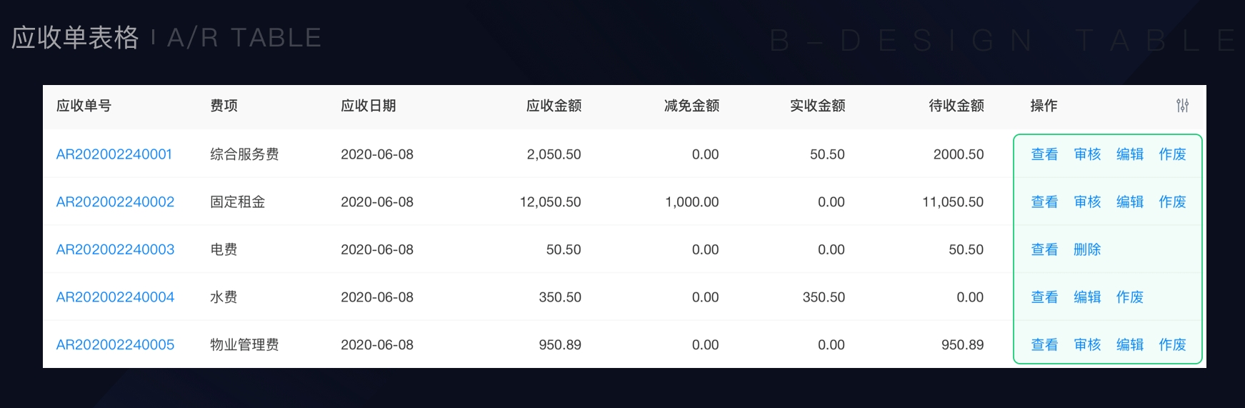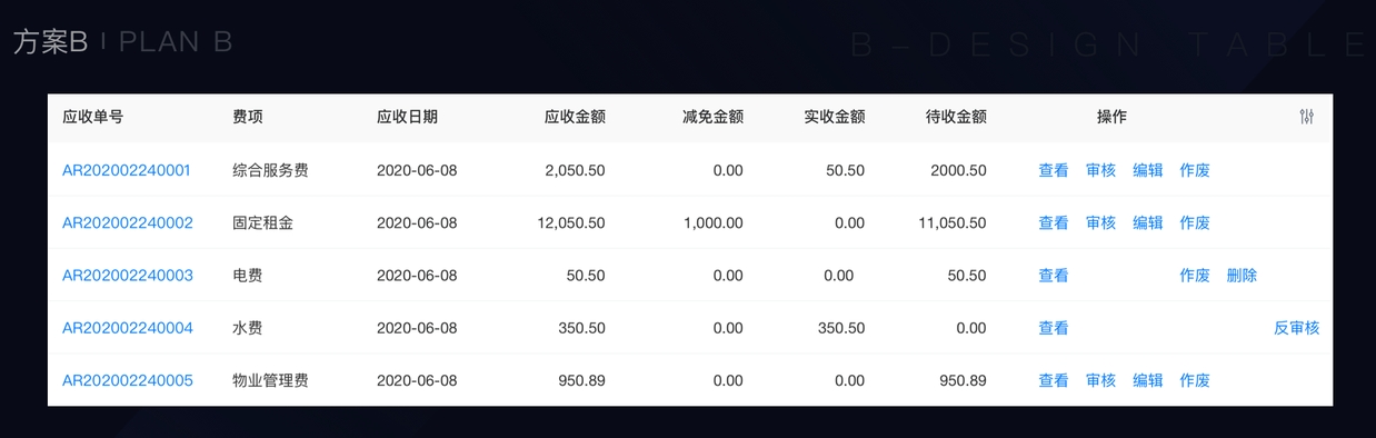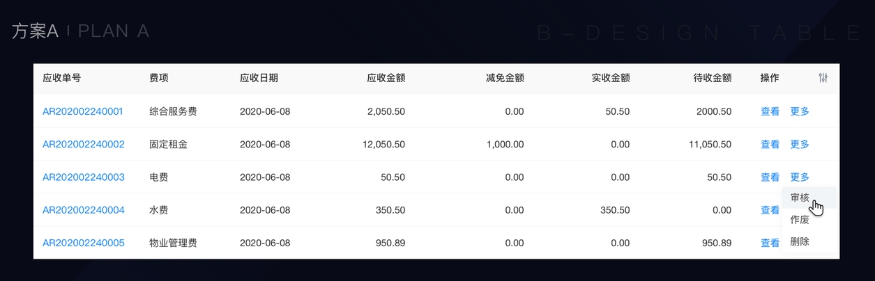 在财务中台系统中,常常由于权限的不同或者单据状态不同这两种原因,使得每行的数据拥有不同的操作项,如下图所示: