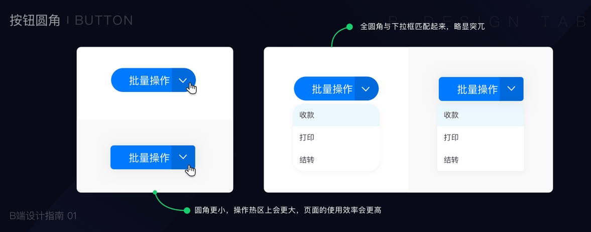 同时在实际业务中,按钮常常被当作原子与下拉框联动组成下拉菜单控件;如若使用半圆按钮则无疑增加了下拉框的设计难度并且匹配起来也会略显突兀。