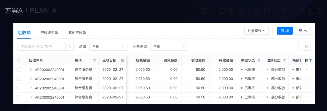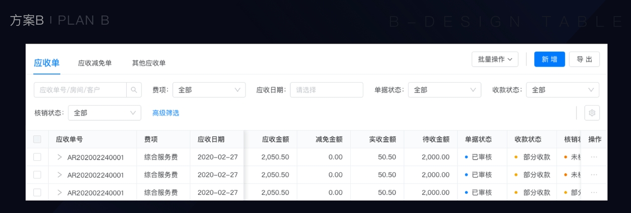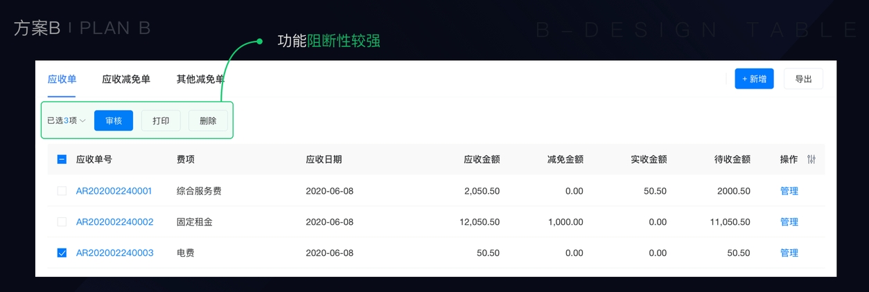 讨论结果:方案B的阻断性强 — 无法兼顾批量操作和数据筛选功能,无法满足复杂系统的场景操作。