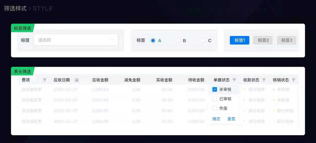 整合筛选项,采用表头筛选+标签筛选的样式,缩减筛选区的页面空间占比。