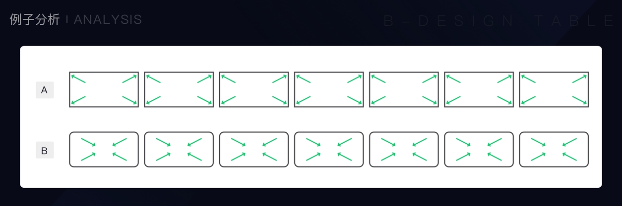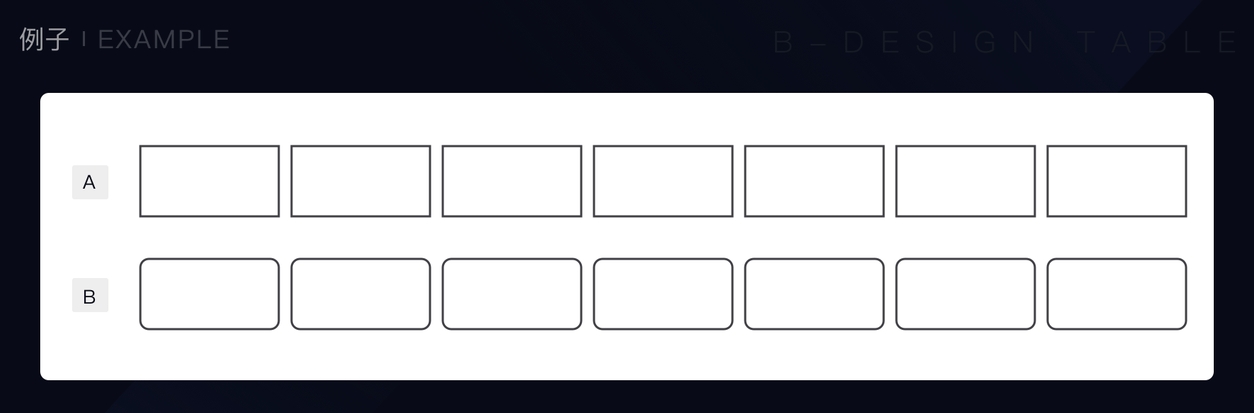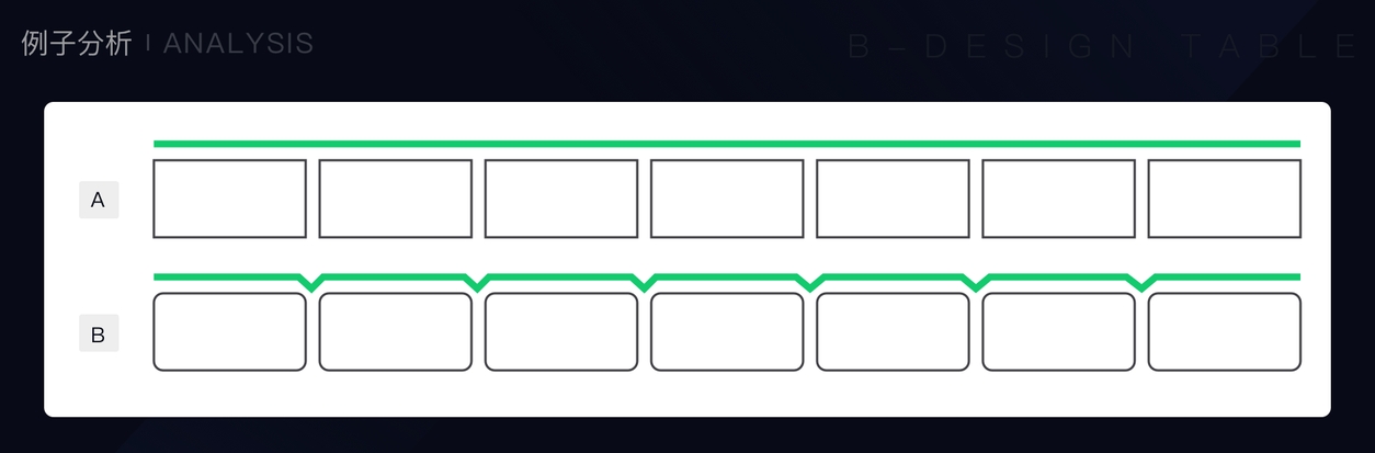 首先,第一眼看过去的时候,A 排的矩形整体是连在一起的,中间找不到断点;而B 排矩形,因为有圆角的关系,所以断点很明显。