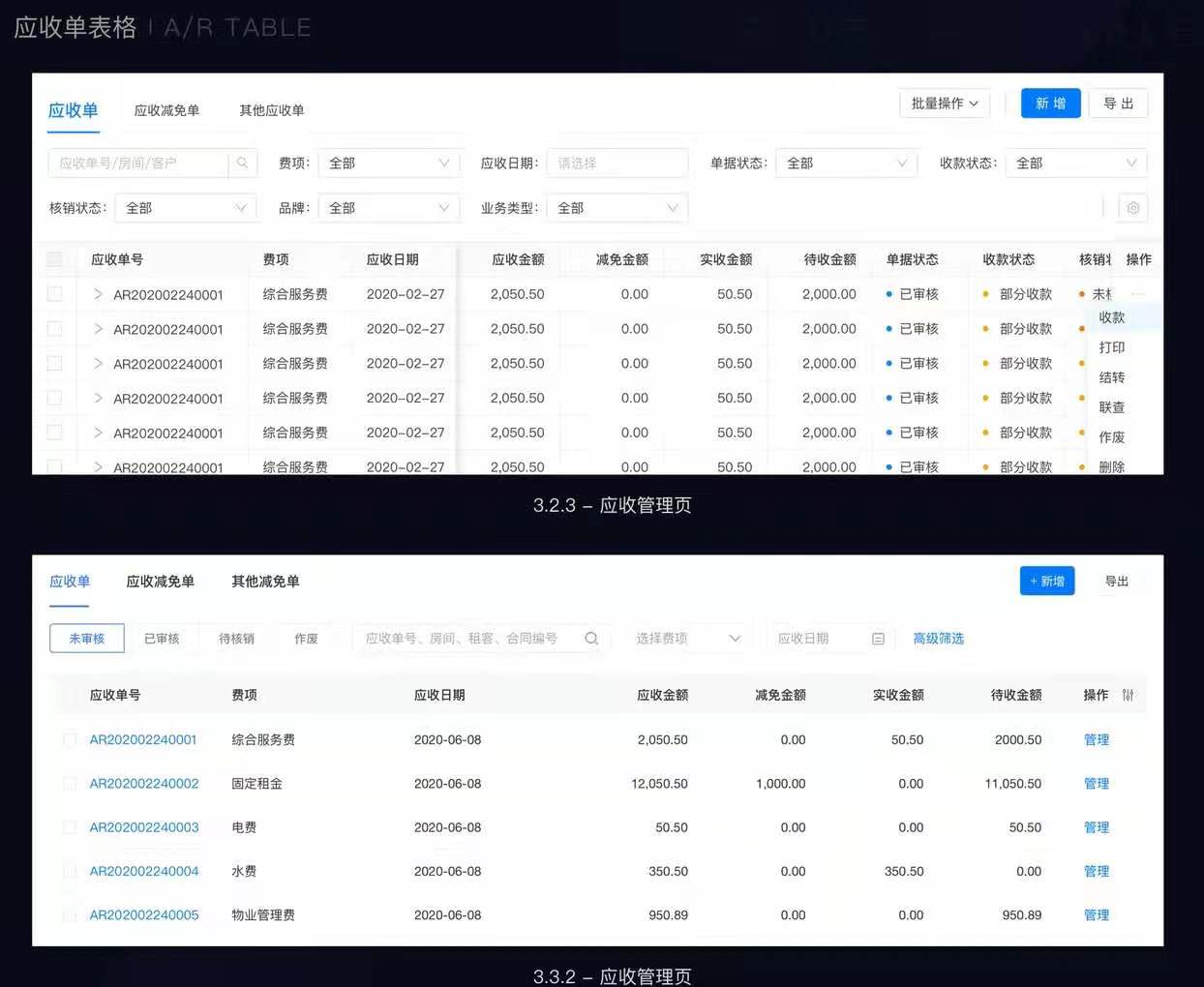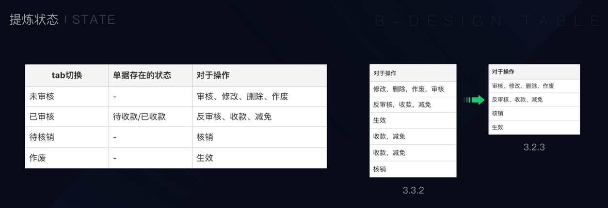 结合业务流程可以很明显的注意到,单据只有通过了审核才能收款,只有收款才能进行核销。状态是一种递进关系(审核 ➡️ 收款 ➡️ 核销)。