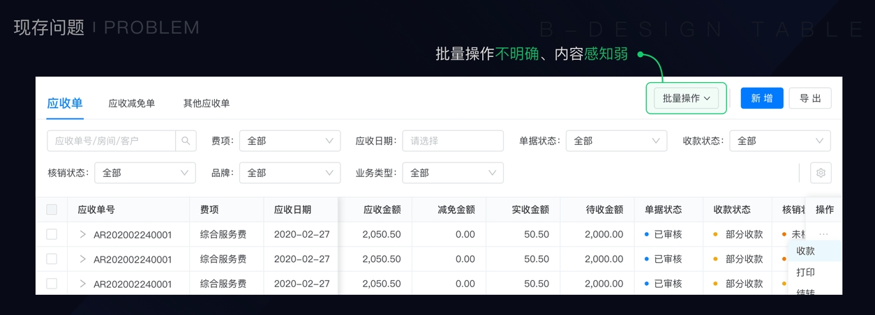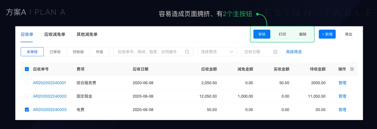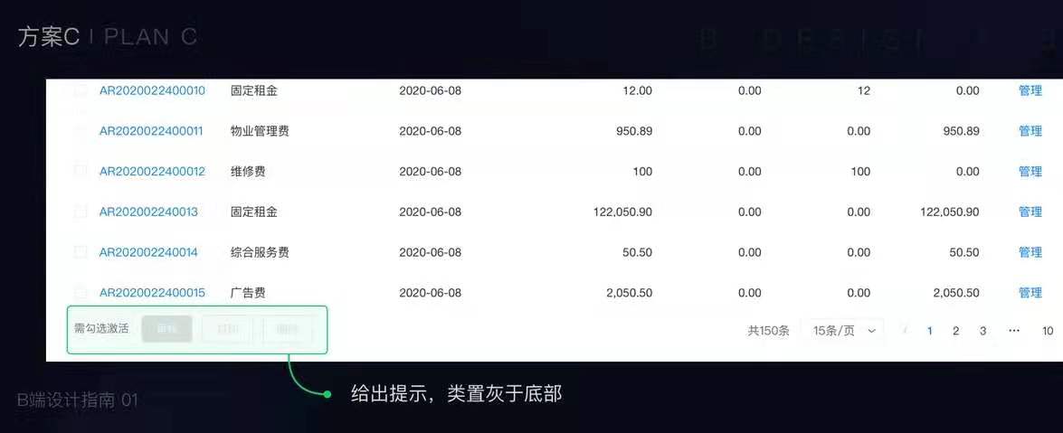 其次,批量操作的功能属于财务中台的核心功能点,隐藏不是第一选择,而是类置灰的特除处理(在按钮旁给提示信息)。