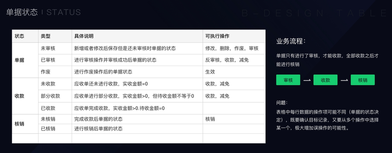 结合财务人员的工作流,提炼出单据的以下几种状态,之前存在到问题(表格中单行数据的操作不一致),也得到了完美的解决。如图: