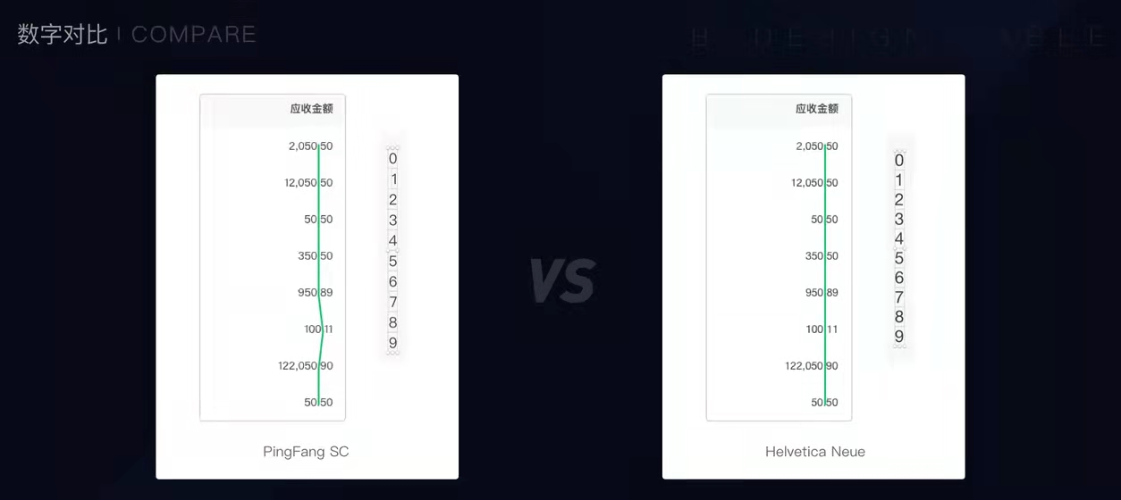 苹方在数字字符上,不同数字宽度不一致,导致千位分隔符不在一条线上;而Helvetica Neue数字等宽,千位分隔符有序的排列在一条线上;所以,选择Helvetica Neue作为数字字体的首选字体,数值上下对比的时候,相同位置的数字在同一条竖线上,更加容易对比。