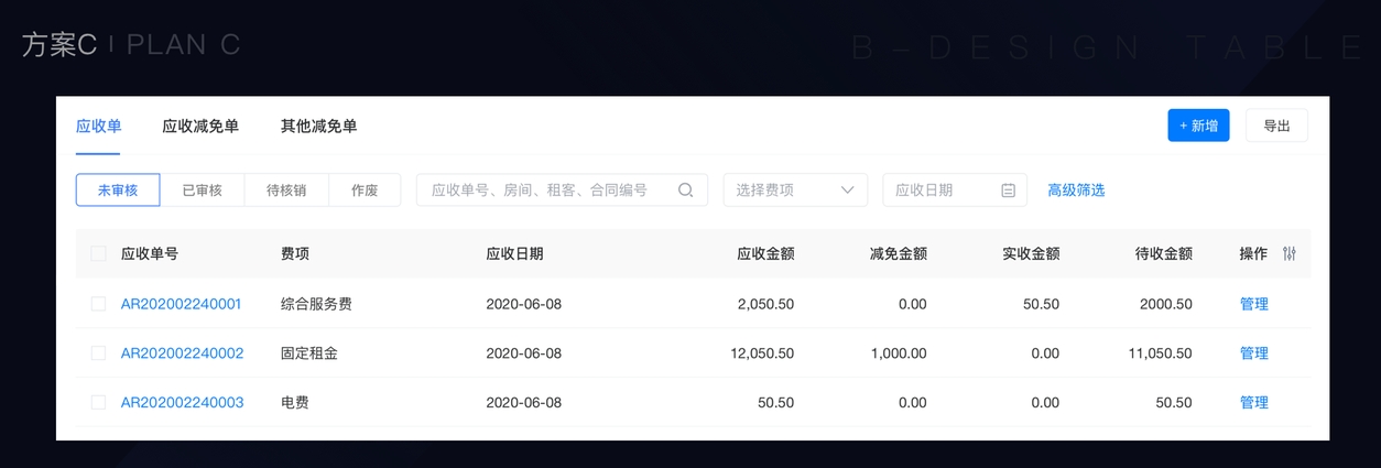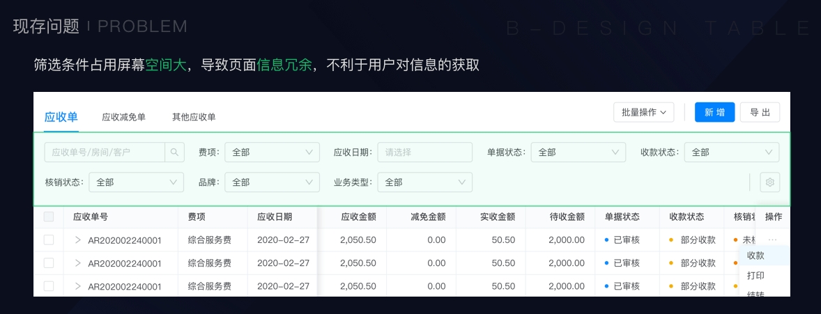 A、数据集往往很庞大,表格不能展示所有字段,往往采用列固定的形式来呈现数据的完整性。以财务中台为例,高频筛选功能已被遮挡(如上图),筛选前需先对表格进行横向滚动,无端增加操作;