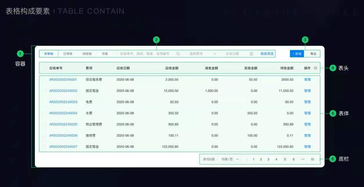 容器、筛选区、功能性按钮、表头、表体及底部栏等六个部分,如下图所示