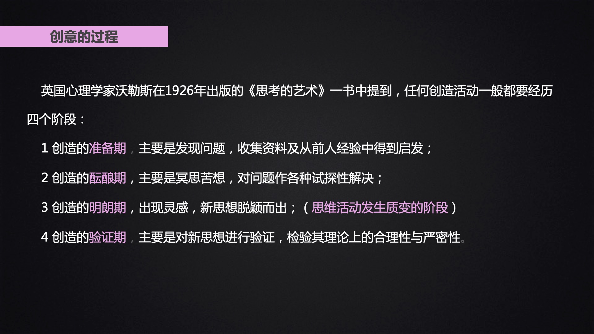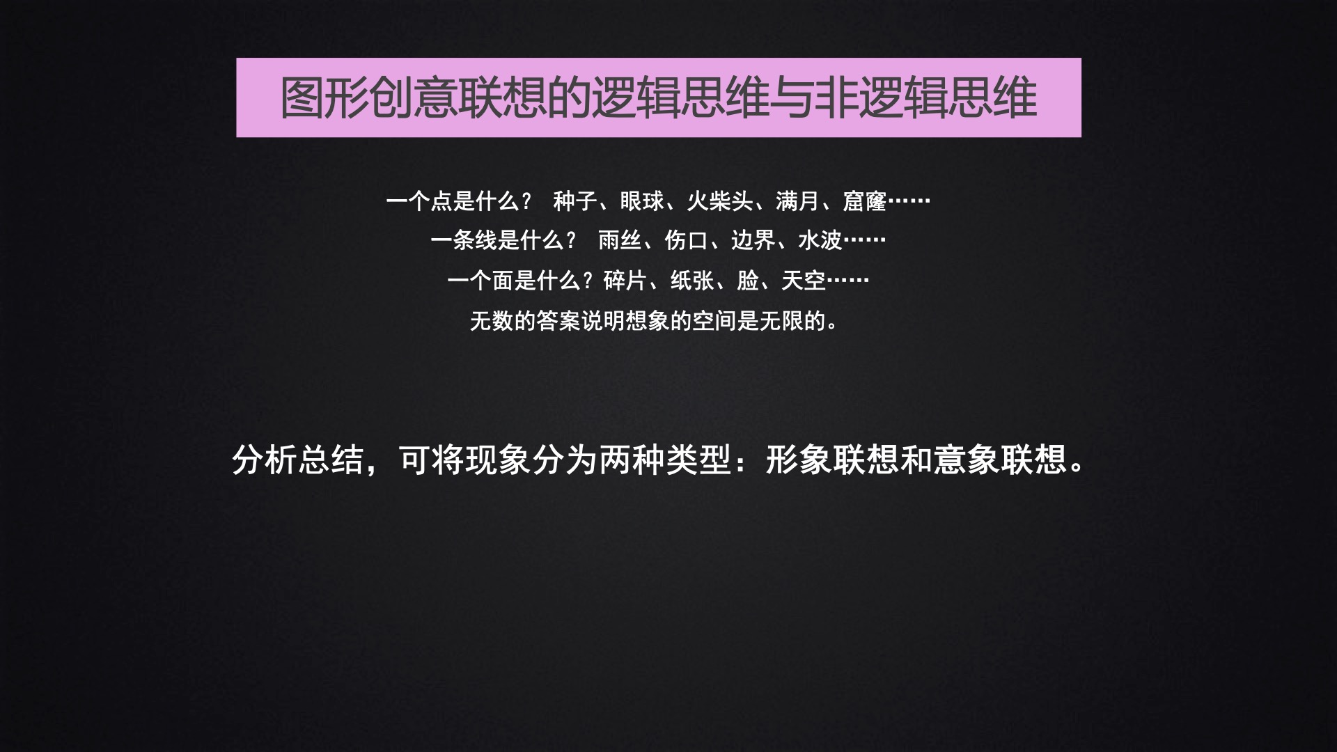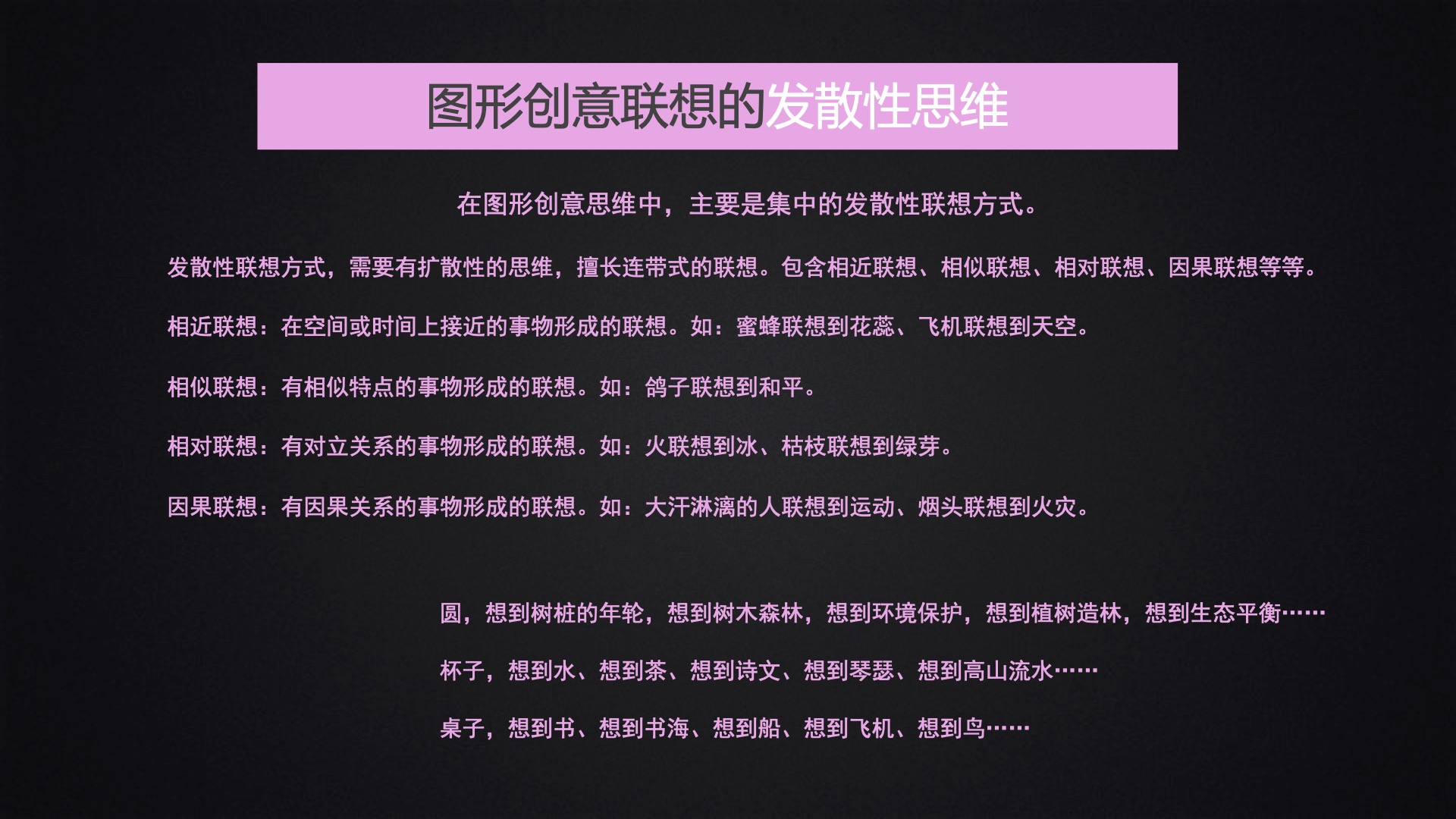 该部分主要跟大家分享了创意的过程、创意的思维模式、联想的类型以及联想的方法: