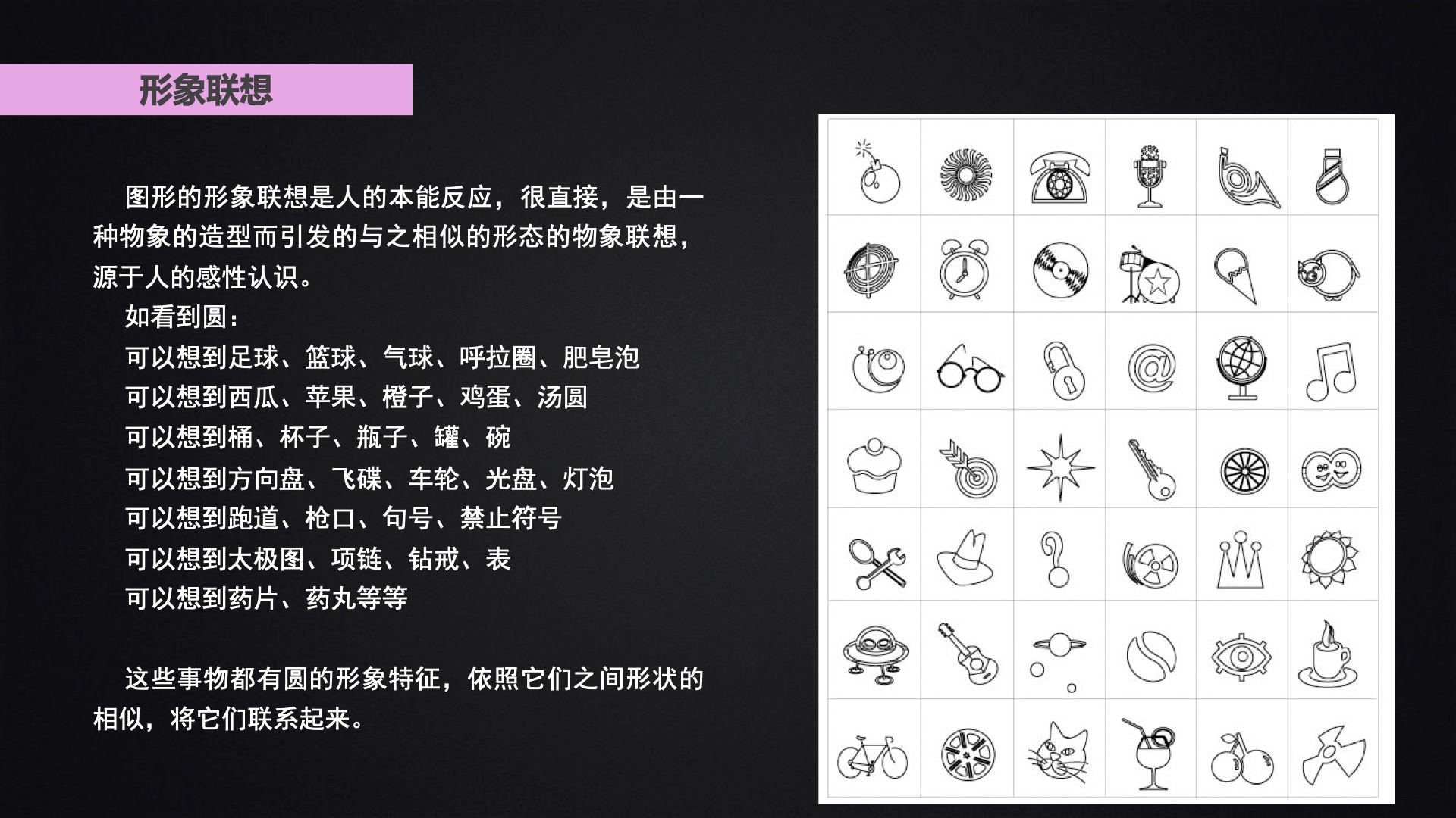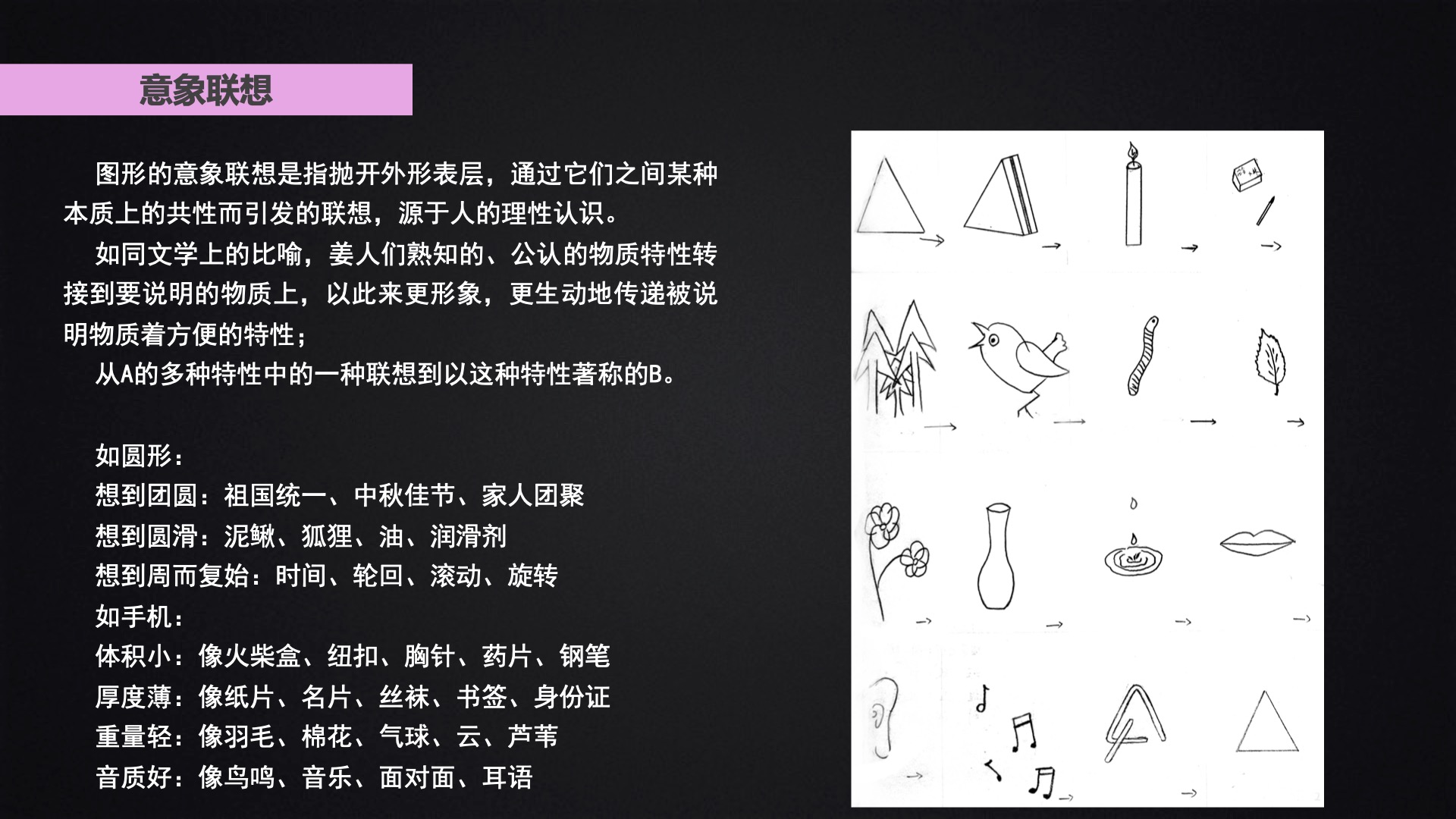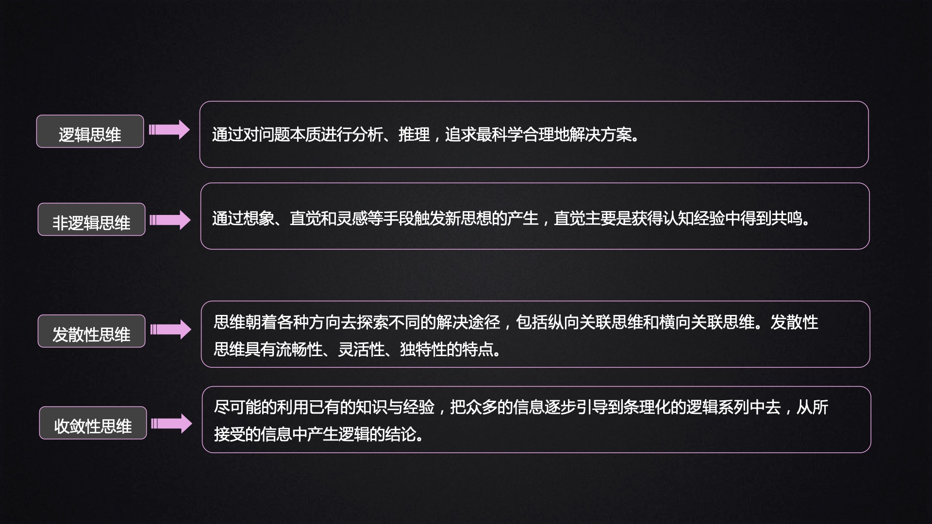 该部分主要跟大家分享了创意的过程、创意的思维模式、联想的类型以及联想的方法: