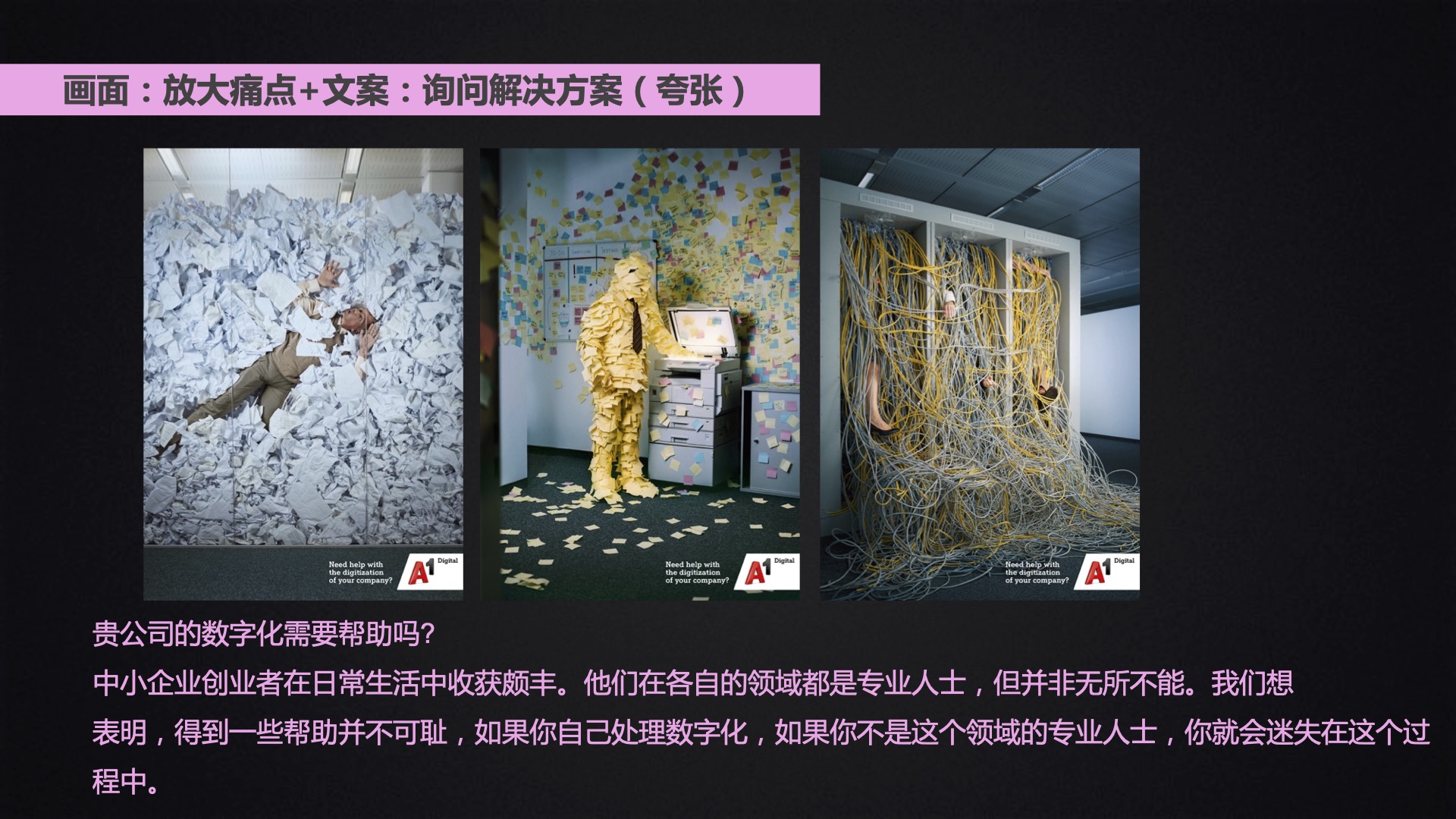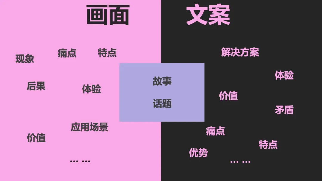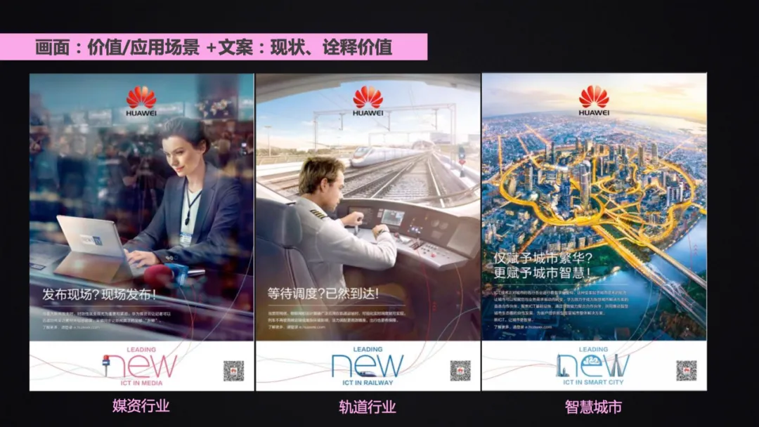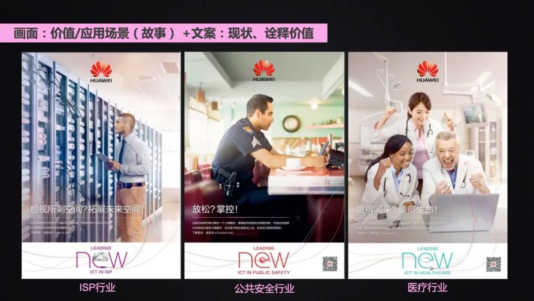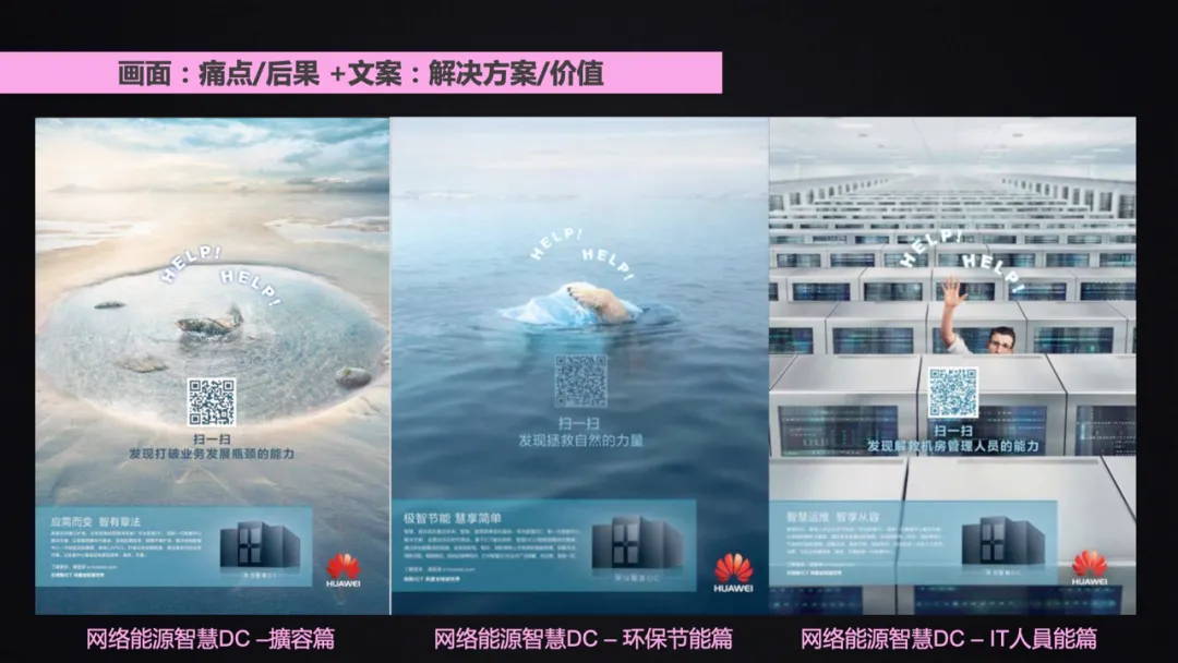 画面和文案可以结合我们常用的华为的业务场景分为“痛点”“特点”“价值”“应用场景”等进行组合,将其将其“包装成一个故事”或者“形成一个话题”以达到表达的目的;