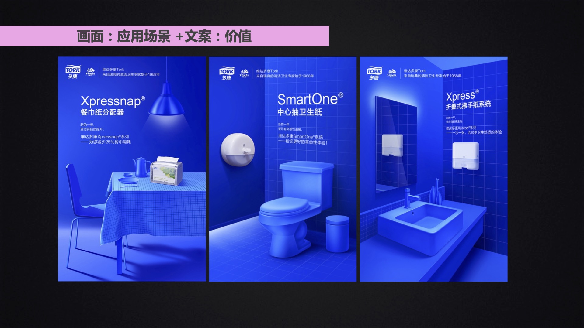 创意核心要点:维达多康为各个行业提供清洁解决方案,将纸巾容器放置于各场景,通过文案呈现系列产品不同价值;视觉配色上,整张海报仅使用两个颜色,便于将产品与场景区分,突出产品形象,画面精细处理,文案3D方式排版融入场景;