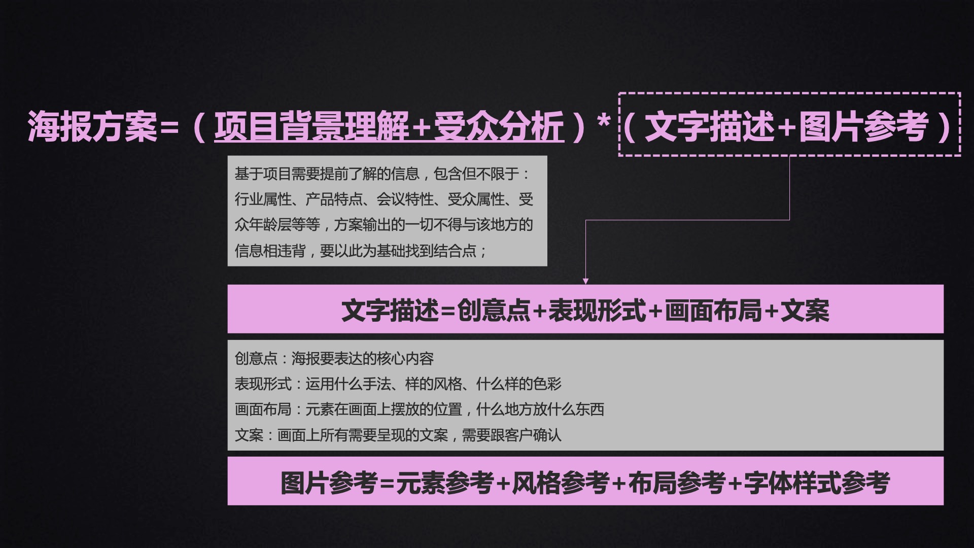海报方案=(项目背景理解+受众分析)*(文字描述+图片参考)