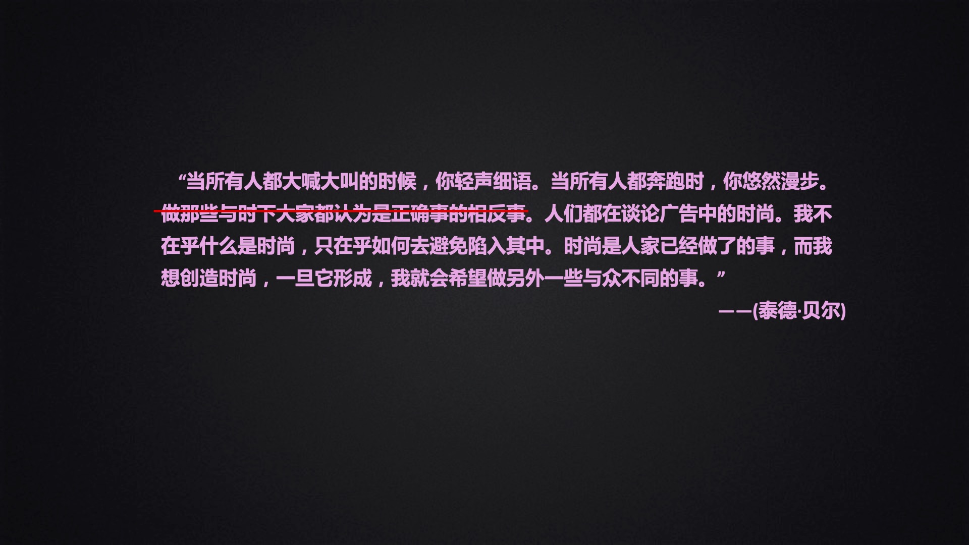 “当所有人都大喊大叫的时候,你轻声细语。当所有人都奔跑时,你悠然漫步。人们都在谈论广告中的时尚。我不在乎什么是时尚,只在乎如何去避免陷入其中。时尚是人家已经做了的事,而我想创造时尚,一旦它形成,我就会希望做另外一些与众不同的事。”