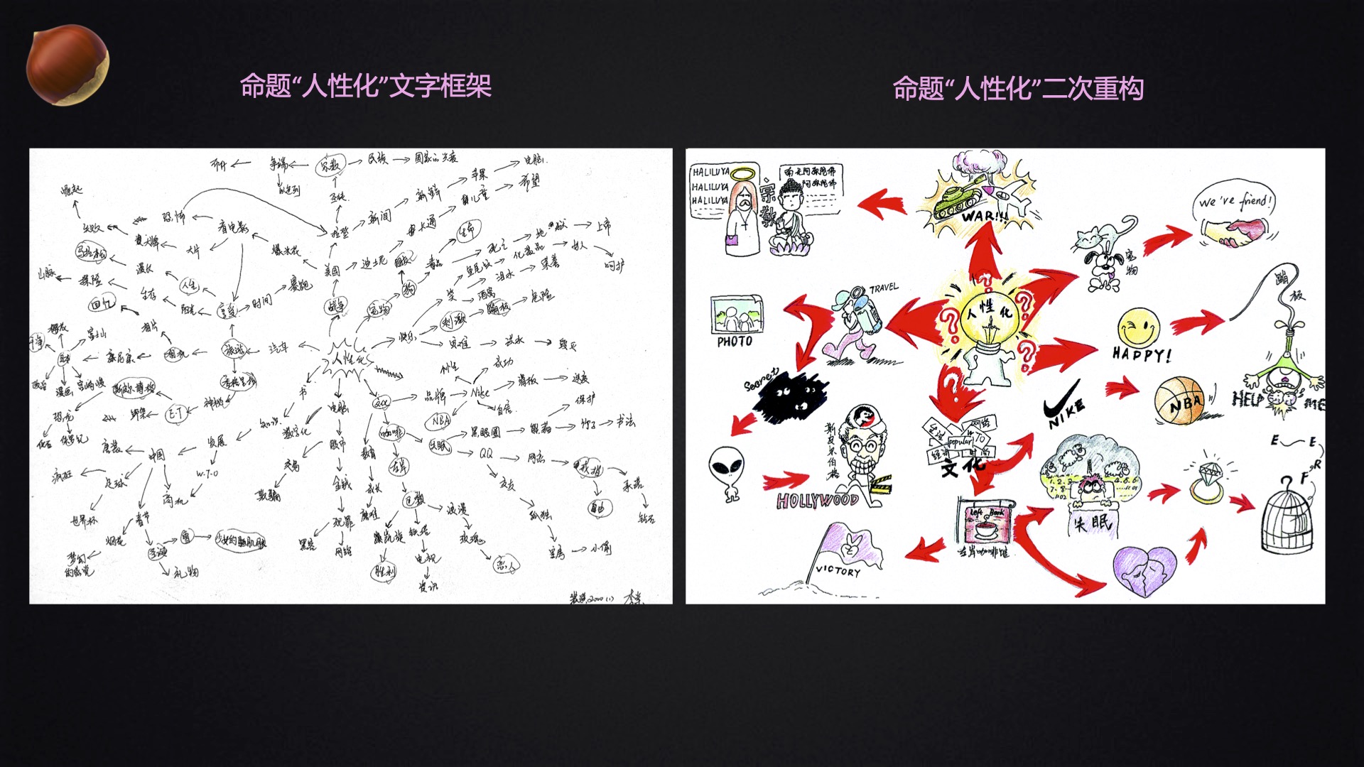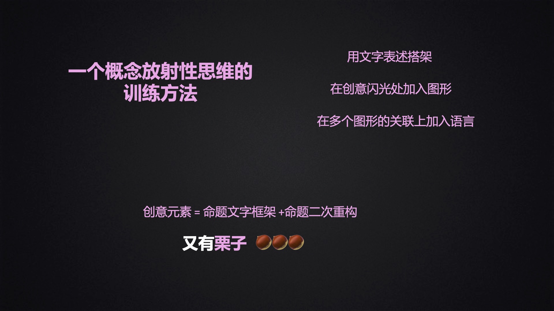 3、联想是创意来源的最重要的动作,除了日常大家会组织的“头脑风暴”之外,通过文字表述框架搭建在道二次重构可以帮助大家进行发散出与收敛;