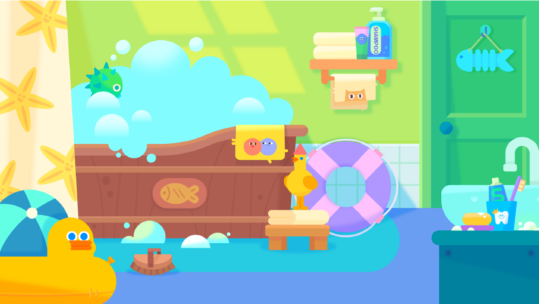 雪球很喜欢大海,浴室里很多海洋生物的装饰和玩具,有小鱼、河豚、海星等等。
