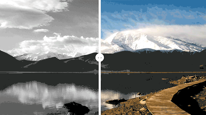 照一张照片,拖入PS,裁剪成画布尺寸,然后分别保存一张正常色彩的和去色黑白的。然后把黑白的拖入红色矩形,正常颜色的图片拖入蓝色矩形。双击正常颜色的图层,调整图片的位置,让图片最右侧和矩形右侧对齐。