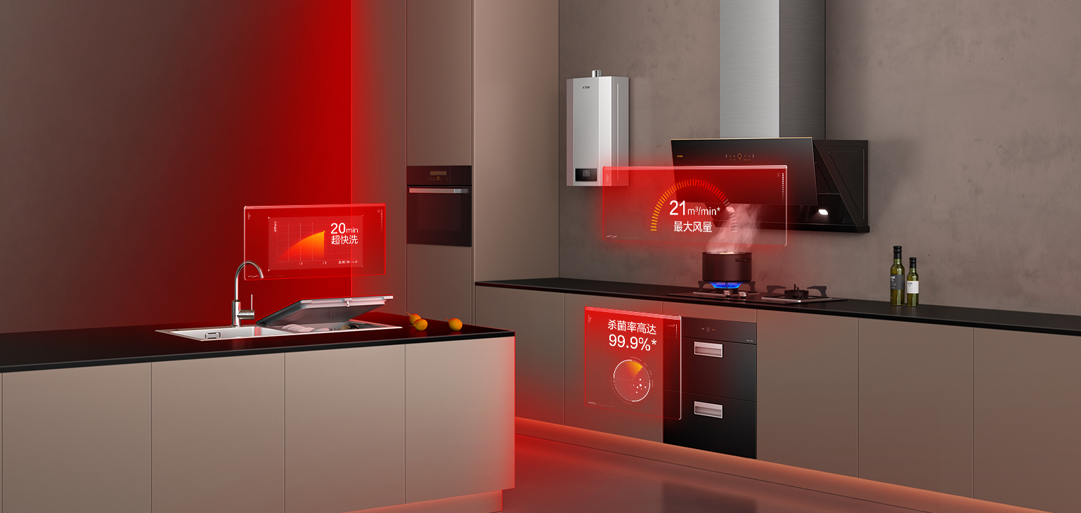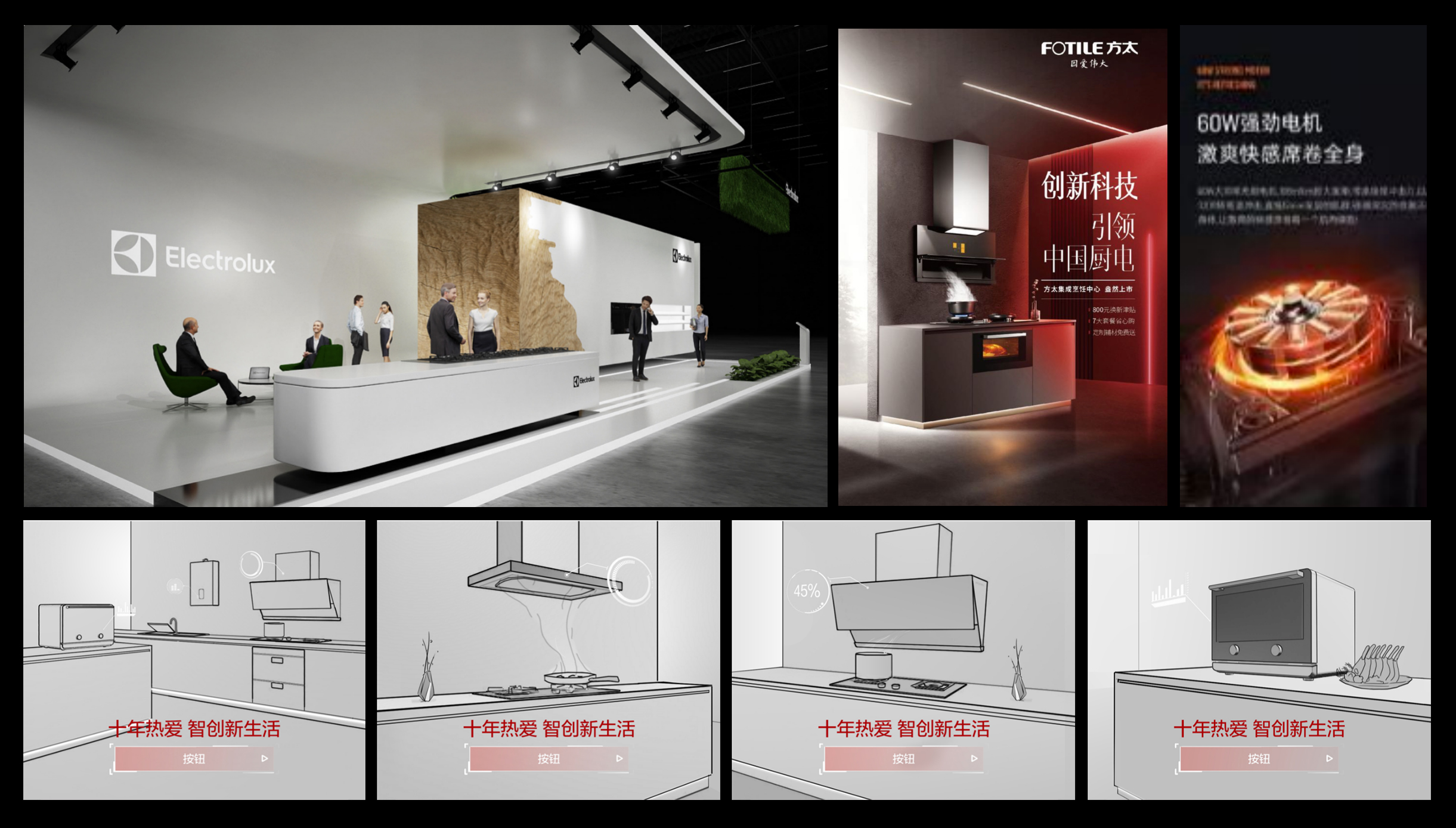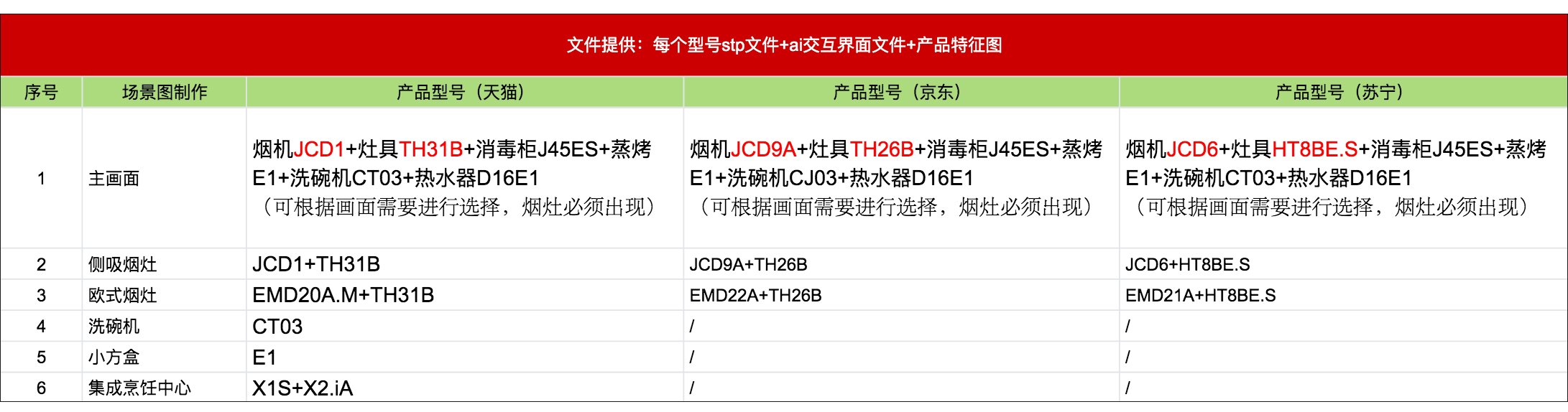 ① 画面制作过程中必须要注意的点:a产品要突出,需要保证产品质感(油烟机打开吸烟状态,烟可以做成动效状态;灶具有火有锅;洗碗机打开但不要全开,水槽内装有果蔬或碗碟;蒸烤如果可以看到箱体内部,则放食物);b场景保持简洁,不要有过多的装饰物;c红色界面内容要表达产品性能点,即不要出现与产品无关的内容,择重要的表达。
