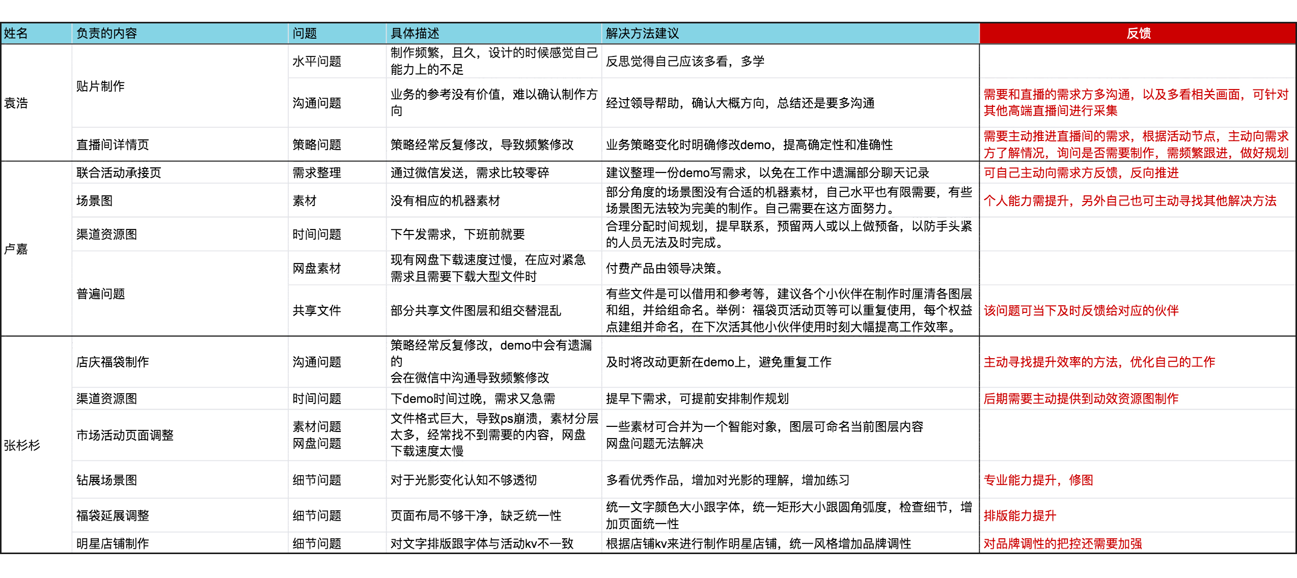 我们各自复盘自己负责的内容在执行过程中遇到的问题,过程中要思考在下次类似的活动中我们要如何执行才能更加高效完成,以及回顾在本次执行过程中没有达到要求和标准的点,为下次完成目标找到避免或解决的方法。