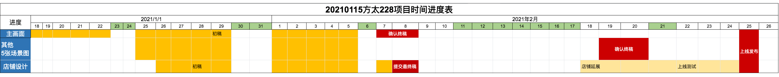① 主视觉时间规划:广告公司给到主视觉制作时间表,根据我们画面上线时间点确认是否合理,预估好过程中可能导致延期的问题,给这些问题留足时间(本次228制作包含了春节假期,非紧急情况,灰色时间段不要做规划,灰色时间段制作效率及质量会打折扣);