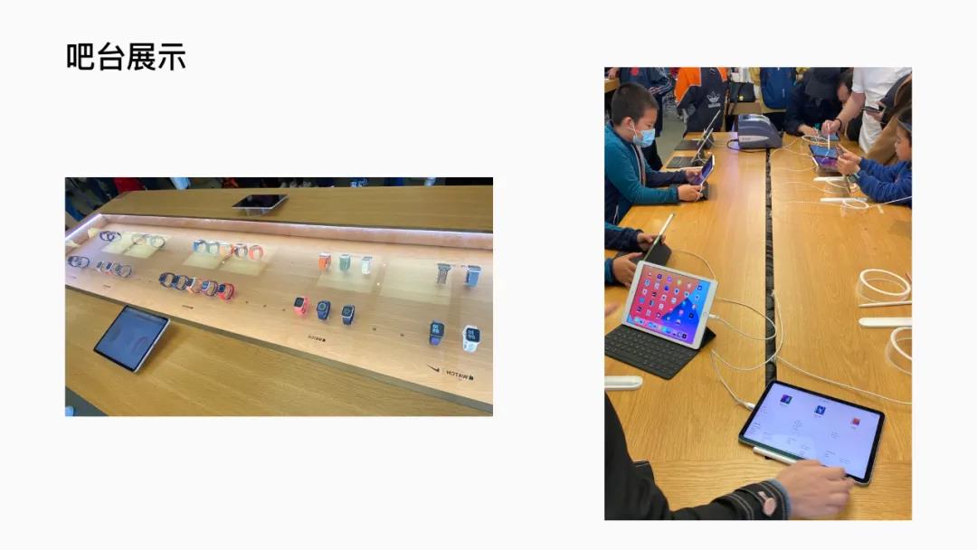 佩戴体验过手表后,旁边的娱乐区和办公区正等待着你,这是发现需求的主战场。娱乐区,主要以平板为主,内搭载很多游戏,以及画图软件,供消费者游玩。办公区,则是平板+键盘,以及 Macbook 的组合,向消费者模拟办公场景,界面主要为 Keynote,Page 等轻办公应用。