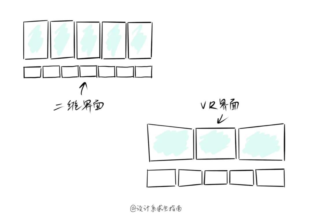 在二维设计稿中,内容是平铺直叙的形式展现,而用户也是通过手机和电脑等分体式的设备浏览。但是当用户带上VR眼镜,VR设备和用户是一体的,由于镜片的原因,凸面镜的特性和可视面积减少,会导致界面两端内容出现失真和模糊的情况,这个时候需要考量Z轴深度设计。最终,经过大量测试,就是大家在市面上看到行业统一解决方案VR界面采用类似围绕圆柱式布局。