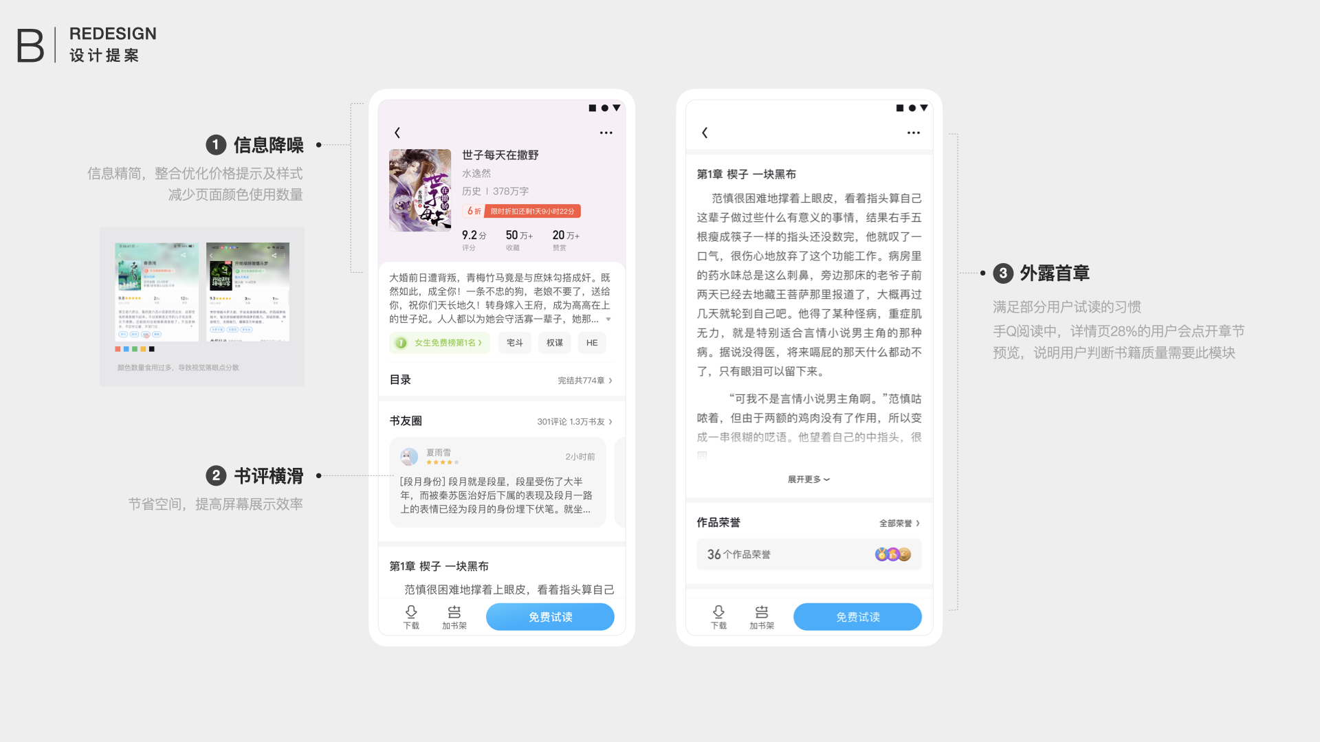 用户可以通过书评快速了解书籍相关信息,本次将书评改为横滑,这样可以为下面的外露首章节省空间。