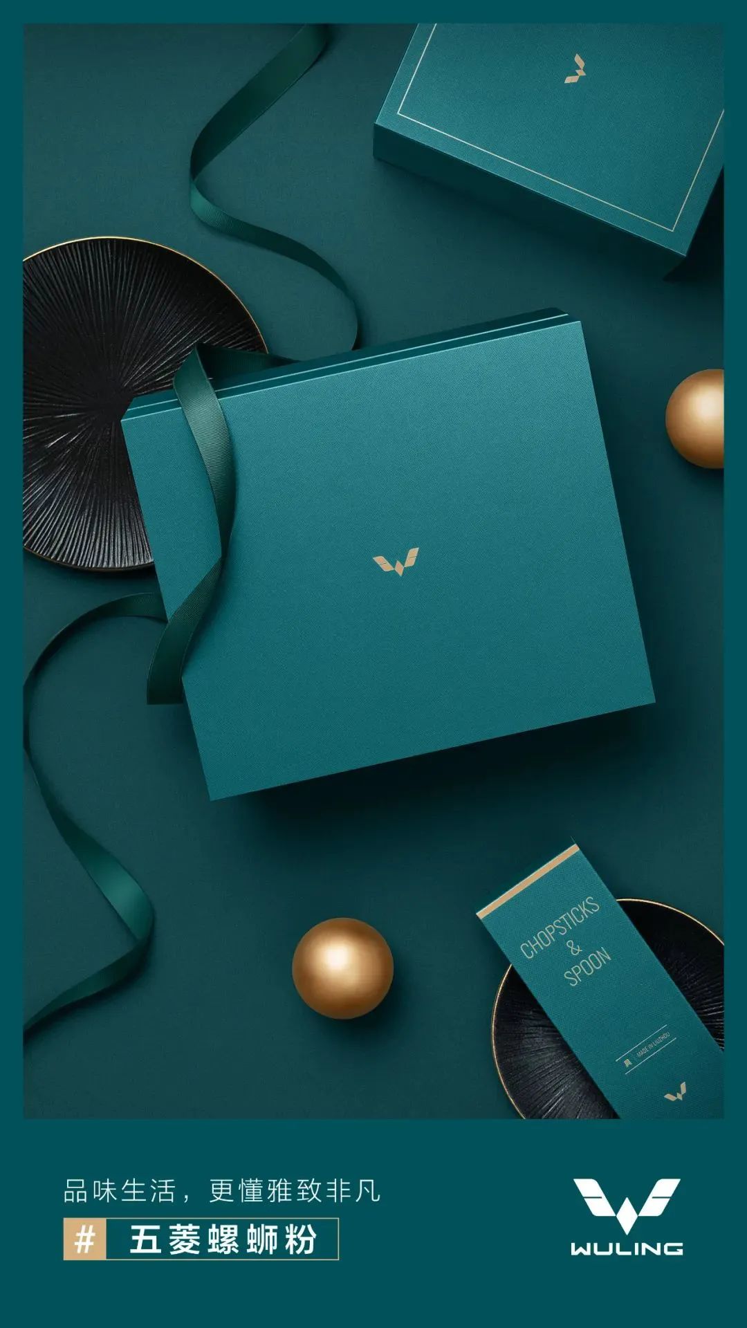 整个礼盒以五菱品牌的奋斗红为主调,以书法的字体烫金“嗦粉”二字点缀。