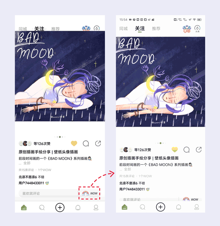 进入“绿洲”的关注页面,评论输入框的最右侧有个“彩虹WOW”图标,点开即可看到一些有趣夸张性的“彩虹屁”评论语句,并可以根据自己的需求点击“换一句”,发送出个性十足的评论。该功能让评论变得十分有趣,提升用户的参与度,十分符合用户不想打字,又想妙语连珠的心态。同时,让产品从一众社交类产品中脱颖而出,给用户留下深刻印象。