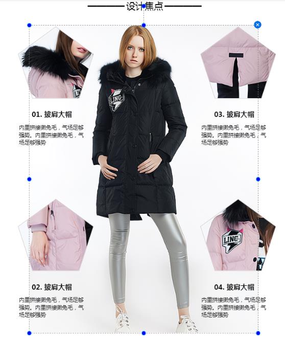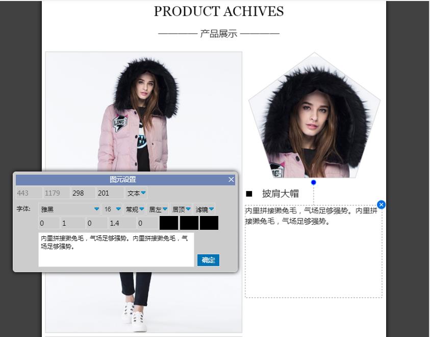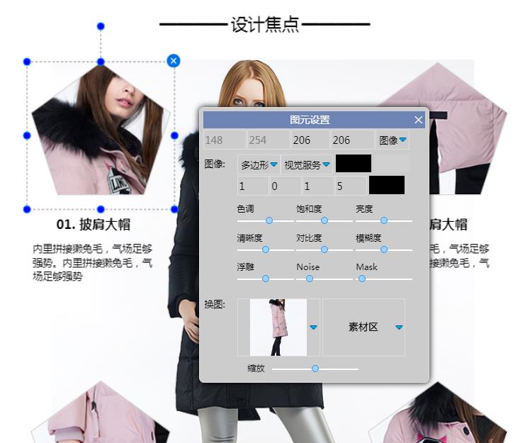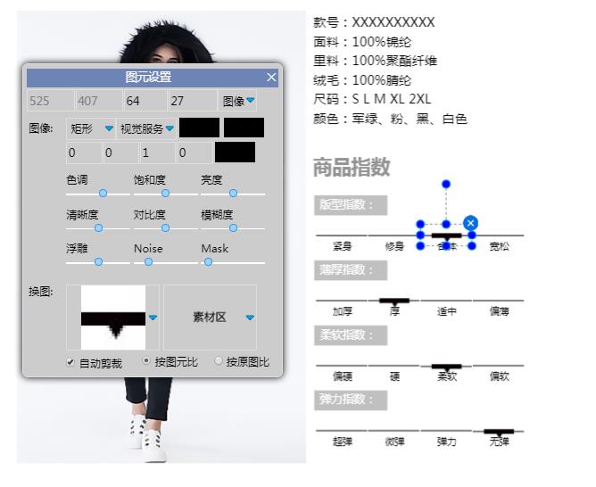 在 “图龙解” 中,反映卖点信息是通过图元内移动图片位置得到的,比如,服装的领部,肩部,腰部,袖子,腿部等,都可瞬间获得描述。在本例中,点击图元内图片直到头部肩帽位置,如图