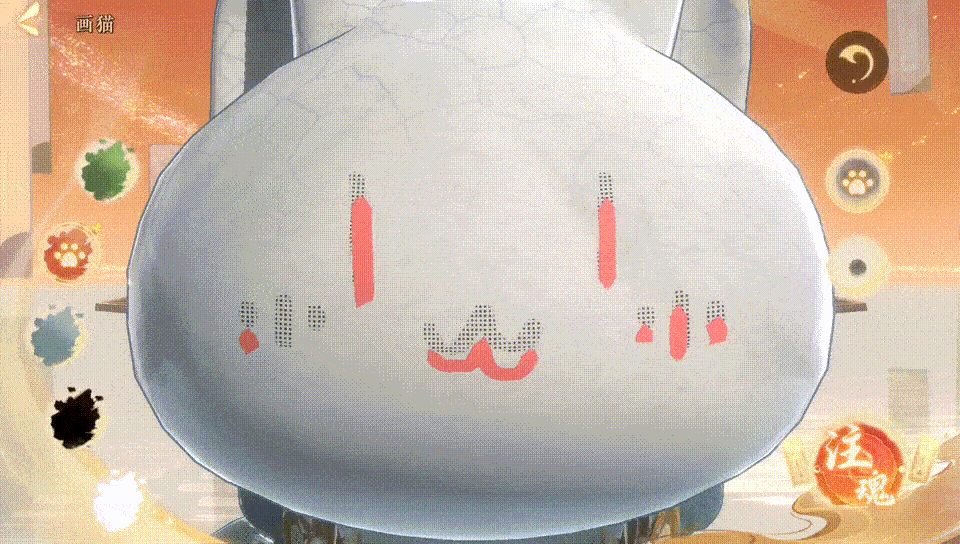 因为是氪金界面,所以这里的UI动效表现是最吸引玩家的,和阴阳师画符咒的区别,就是采用了给可爱的猫咪画表情,召唤名仕,每个玩家都可以根据自己的喜爱画出心里最可爱的它。