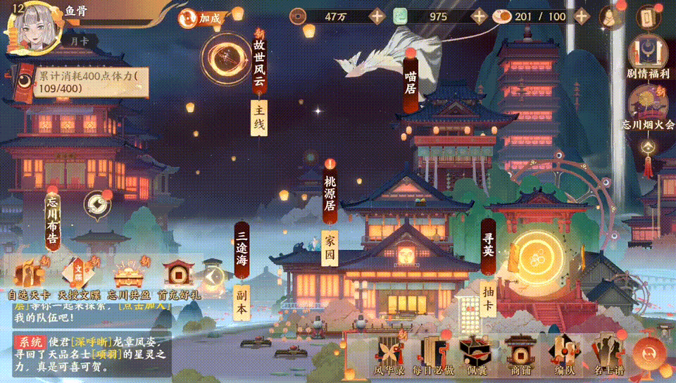 《忘川》二次元国风的风格多以祥云、流沙、火、水墨和燕子等元素,不知道大家有没有发现界面用的最多的一个元素是什么呢?是时辰月亮哟!从月牙到满月!让我们一起看看哪里都运用到了这些元素~