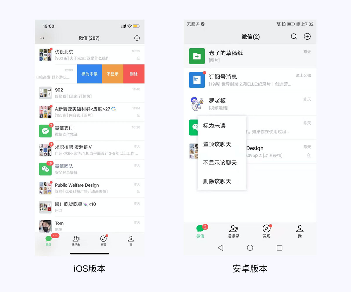 Android和iOS的手势区别比较大,对于隐藏的操作,安卓长按较多,iOS左右滑动较多。以微信为例,安卓针对列表更多操作时,采用长按手势,长按出现菜单。而iOS左右滑动出现隐藏的操作。