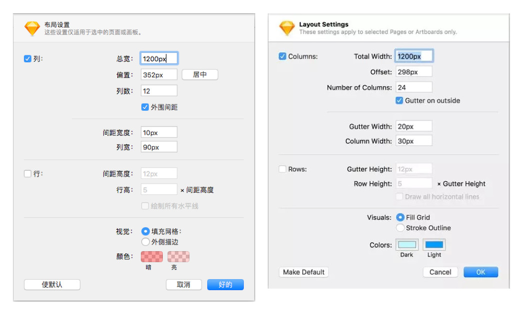 栅格化系统在Sketch里设置非常方便,「视图」-「画布」-「布局设置」即可得到如下界面设置栅格系统。